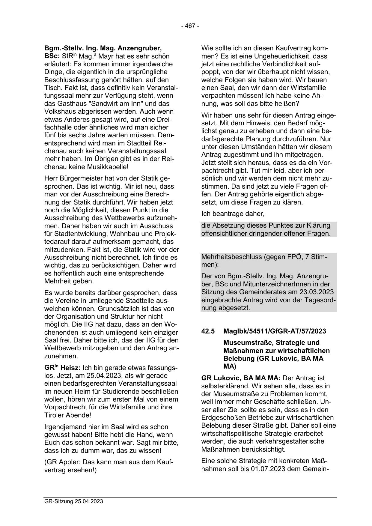 Mehrheitsbeschluss (gegen FPÖ, 7 Stimmen):