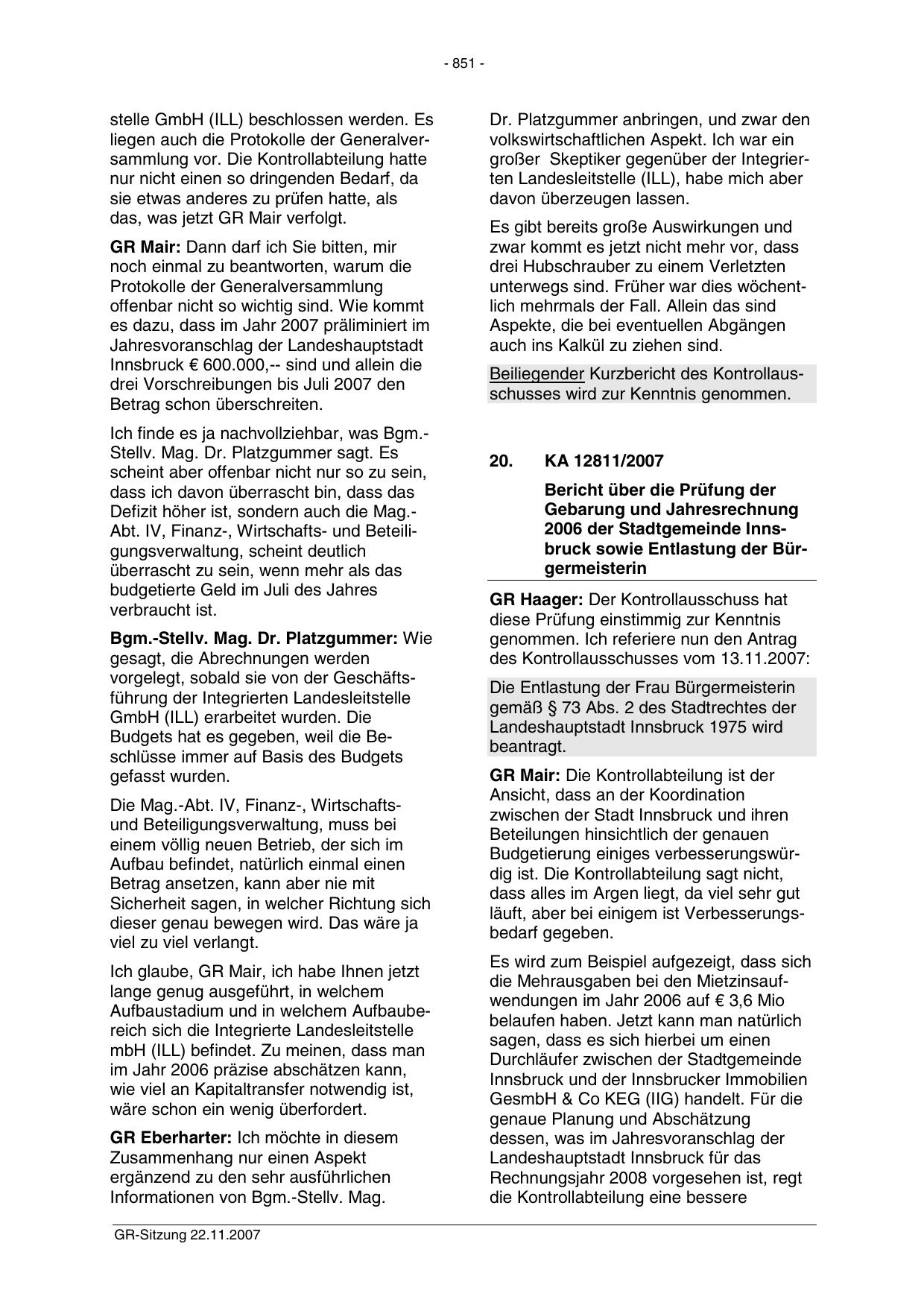 2006 der Stadtgemeinde Innsbruck sowie Entlastung der Bürgermeisterin