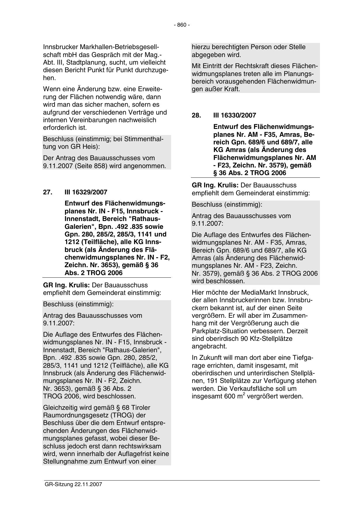Innsbrucker Markhallen-Betriebsgesellschaft mbH das Gespräch mit der Mag.Abt. III, Stadtplanung, sucht, um vielleicht