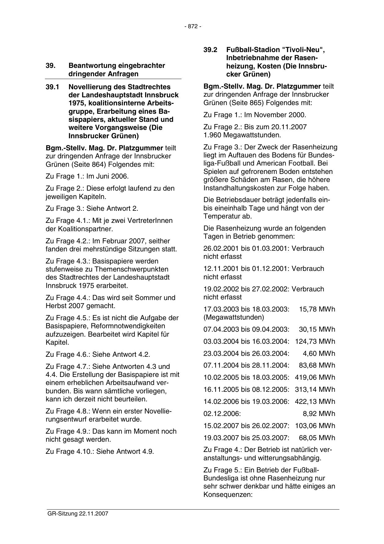 Inbetriebnahme der Rasenheizung, Kosten (Die Innsbrucker Grünen)