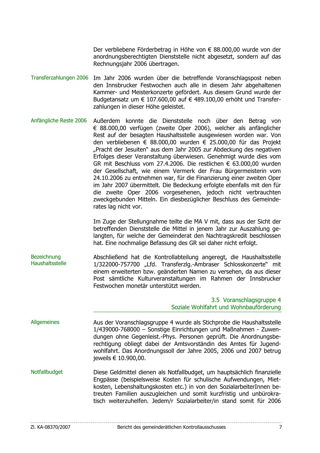1/439000-768000 – Sonstige Einrichtungen und Maßnahmen - Zuwendungen ohne Gegenleist.-Phys. Personen geprüft. Die Anordnungsberechtigung obliegt dabei der Amtsvorständin des Amtes für Jugendwohlfahrt. Das Anordnungssoll der Jahre 2005, 2006 und 2007 betrug