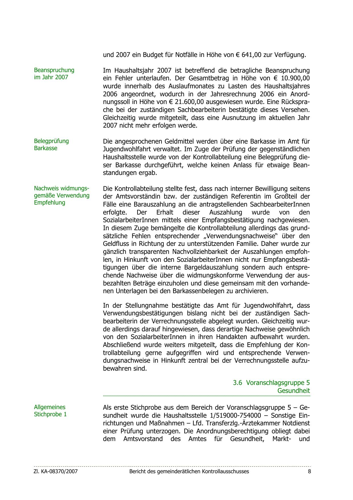 gänzlich transparenten Nachvollziehbarkeit der Auszahlungen empfohlen, in Hinkunft von den SozialarbeiterInnen nicht nur Empfangsbestätigungen über die interne Bargeldauszahlung sondern auch entsprechende Nachweise über die widmungskonforme Verwendung der ausbezahlten Beträge einzuholen und diese gemeinsam mit den vorhandenen Unterlagen bei den Barkassenbelegen zu archivieren.