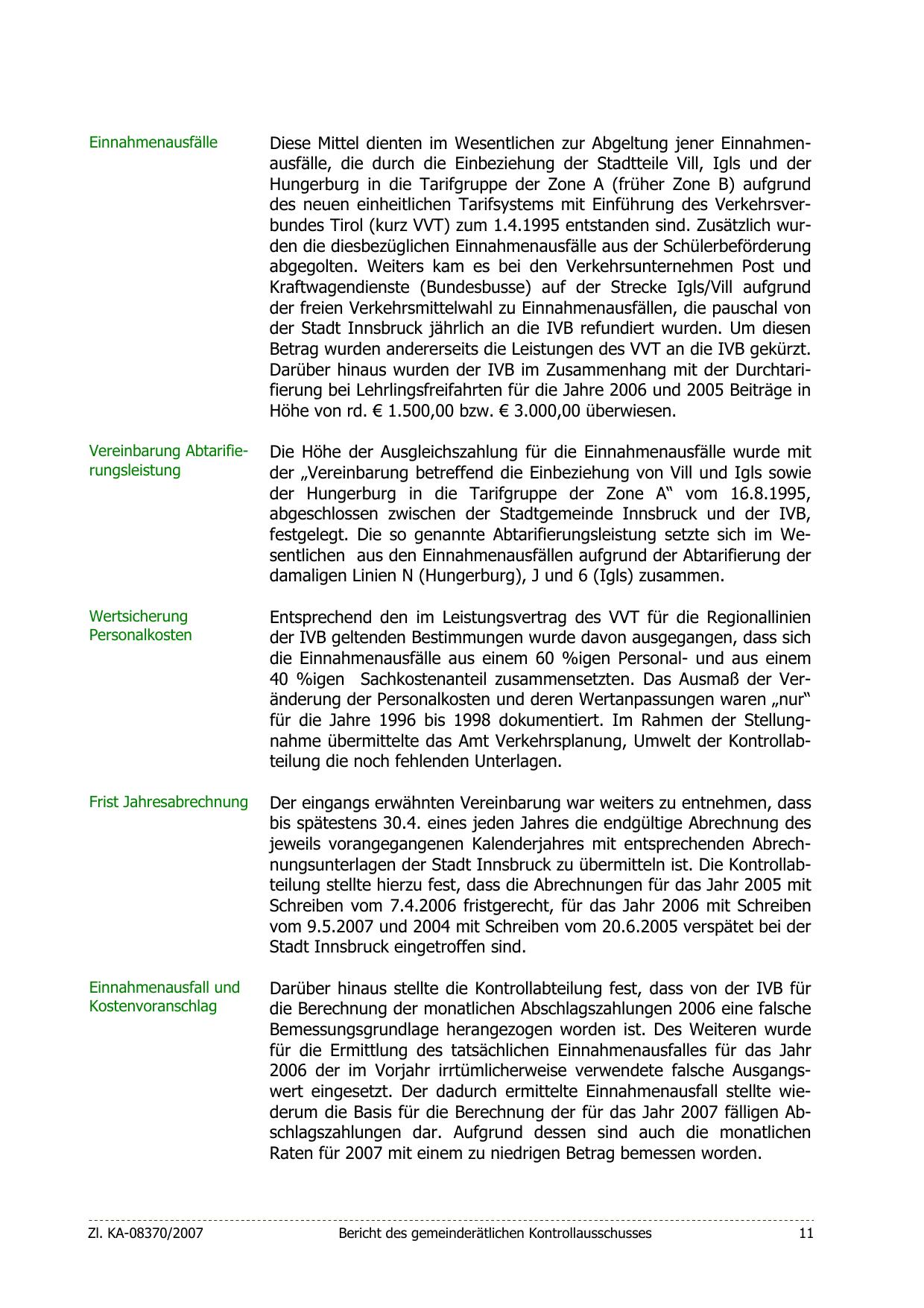 des neuen einheitlichen Tarifsystems mit Einführung des Verkehrsverbundes Tirol (kurz VVT) zum 1.4.1995 entstanden sind. Zusätzlich wurden die diesbezüglichen Einnahmenausfälle aus der Schülerbeförderung