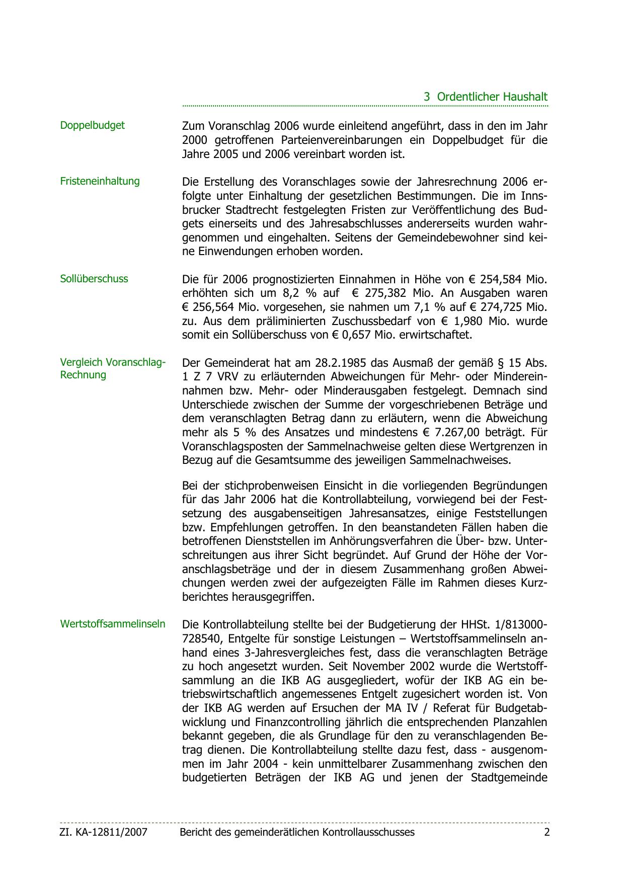 Die Erstellung des Voranschlages sowie der Jahresrechnung 2006 erfolgte unter Einhaltung der gesetzlichen Bestimmungen. Die im Innsbrucker Stadtrecht festgelegten Fristen zur Veröffentlichung des Budgets einerseits und des Jahresabschlusses andererseits wurden wahrgenommen und eingehalten. Seitens der Gemeindebewohner sind keine Einwendungen erhoben worden.