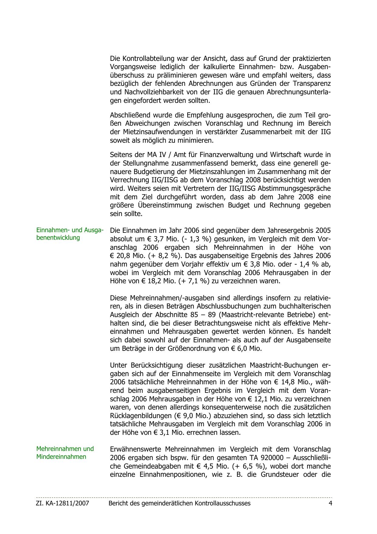 absolut um € 3,7 Mio. (- 1,3 %) gesunken, im Vergleich mit dem Voranschlag 2006 ergaben sich Mehreinnahmen in der Höhe von