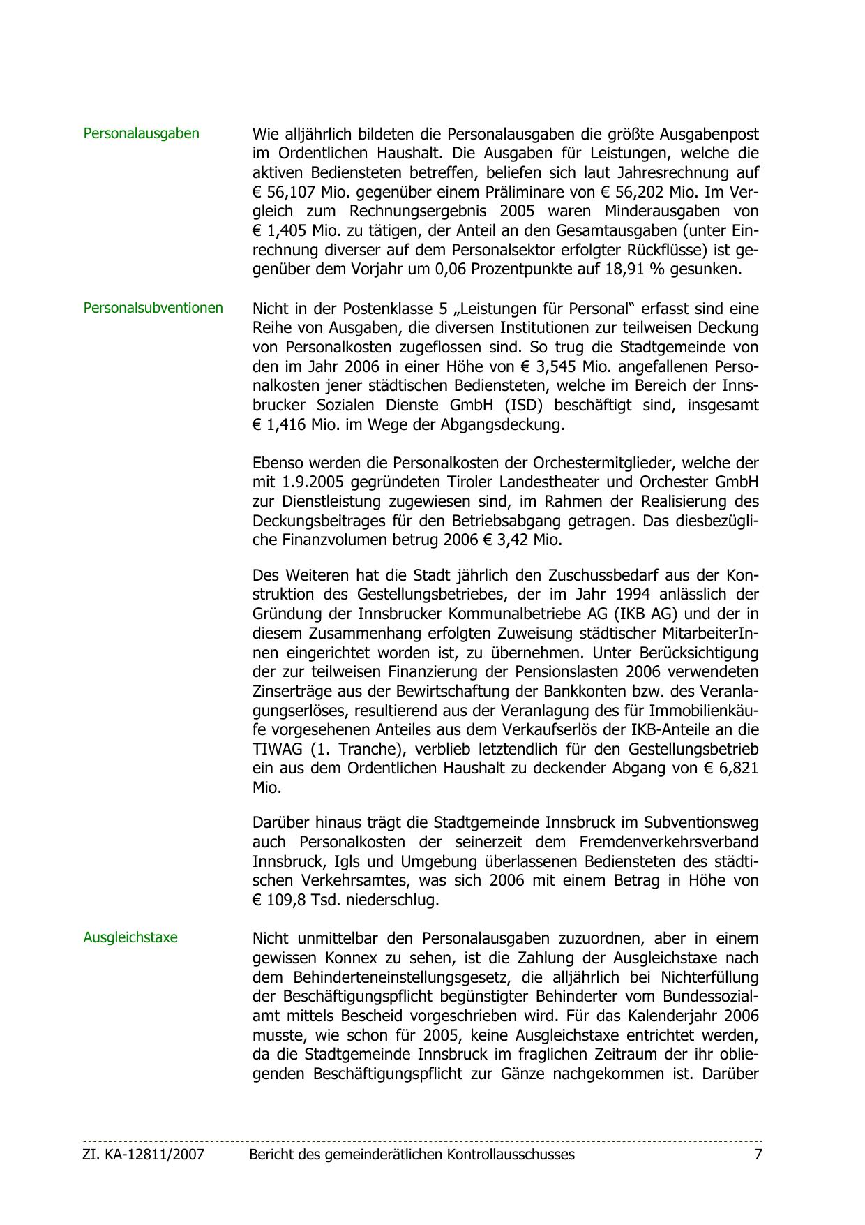 den im Jahr 2006 in einer Höhe von € 3,545 Mio. angefallenen Personalkosten jener städtischen Bediensteten, welche im Bereich der Innsbrucker Sozialen Dienste GmbH (ISD) beschäftigt sind, insgesamt