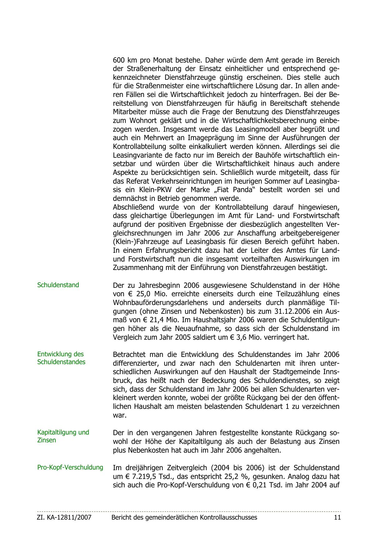 Wohnbauförderungsdarlehens und anderseits durch planmäßige Tilgungen (ohne Zinsen und Nebenkosten) bis zum 31.12.2006 ein Ausmaß von € 21,4 Mio. Im Haushaltsjahr 2006 waren die Schuldentilgungen höher als die Neuaufnahme, so dass sich der Schuldenstand im