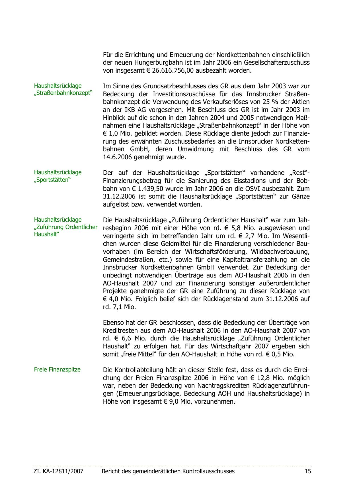 € 1,0 Mio. gebildet worden. Diese Rücklage diente jedoch zur Finanzierung des erwähnten Zuschussbedarfes an die Innsbrucker Nordkettenbahnen GmbH, deren Umwidmung mit Beschluss des GR vom