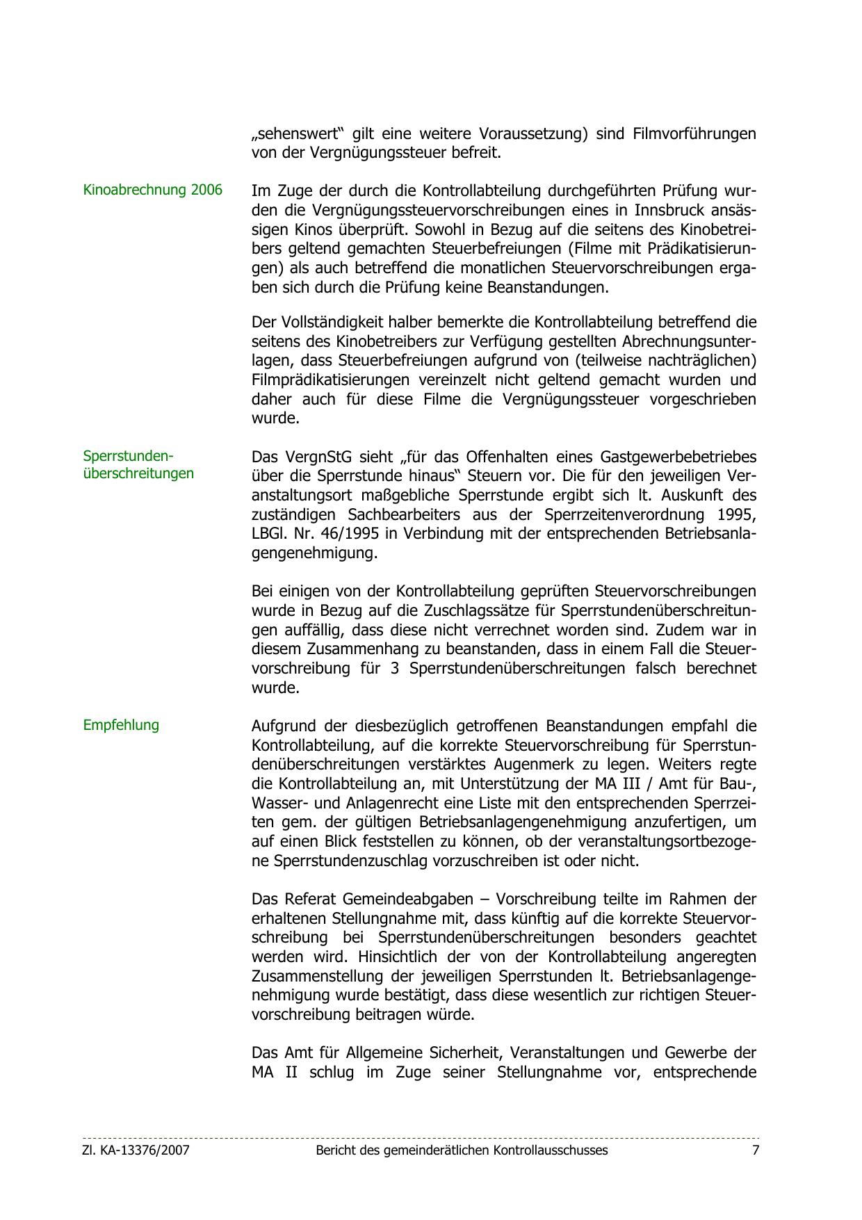 Kontrollabteilung, auf die korrekte Steuervorschreibung für Sperrstundenüberschreitungen verstärktes Augenmerk zu legen. Weiters regte