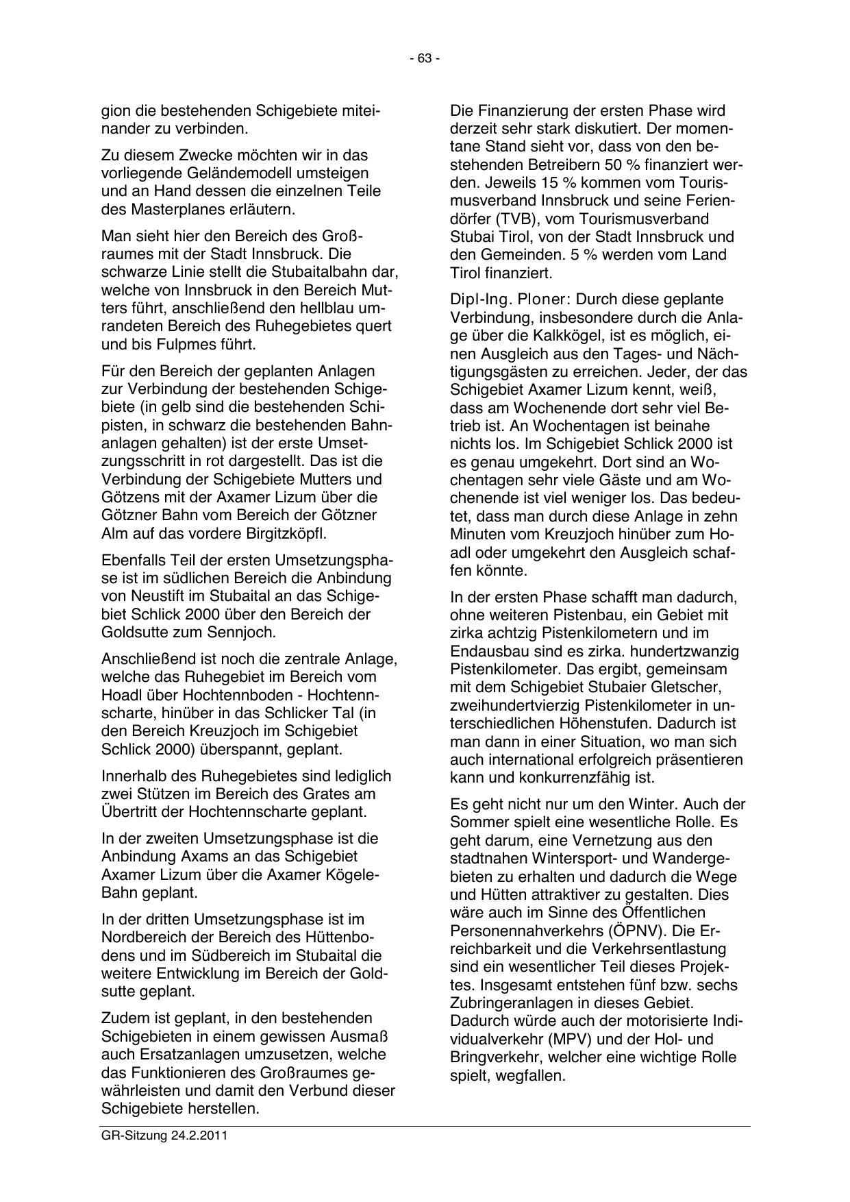 derzeit sehr stark diskutiert. Der momentane Stand sieht vor, dass von den bestehenden Betreibern 50 % finanziert werden. Jeweils 15 % kommen vom Tourismusverband Innsbruck und seine Feriendörfer (TVB), vom Tourismusverband