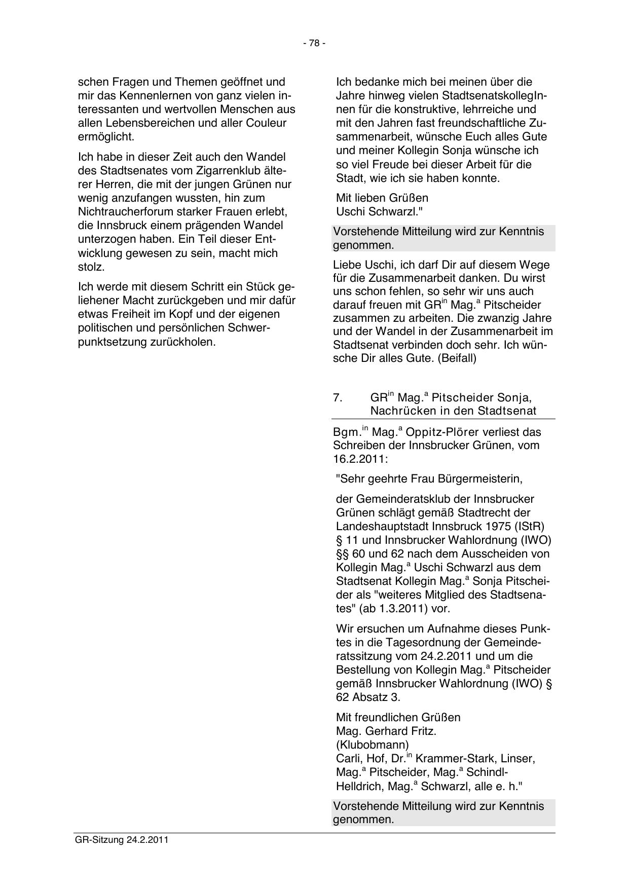 Stadtsenat Kollegin Mag.a Sonja Pitscheider als "weiteres Mitglied des Stadtsenates" (ab 1.3.2011) vor.