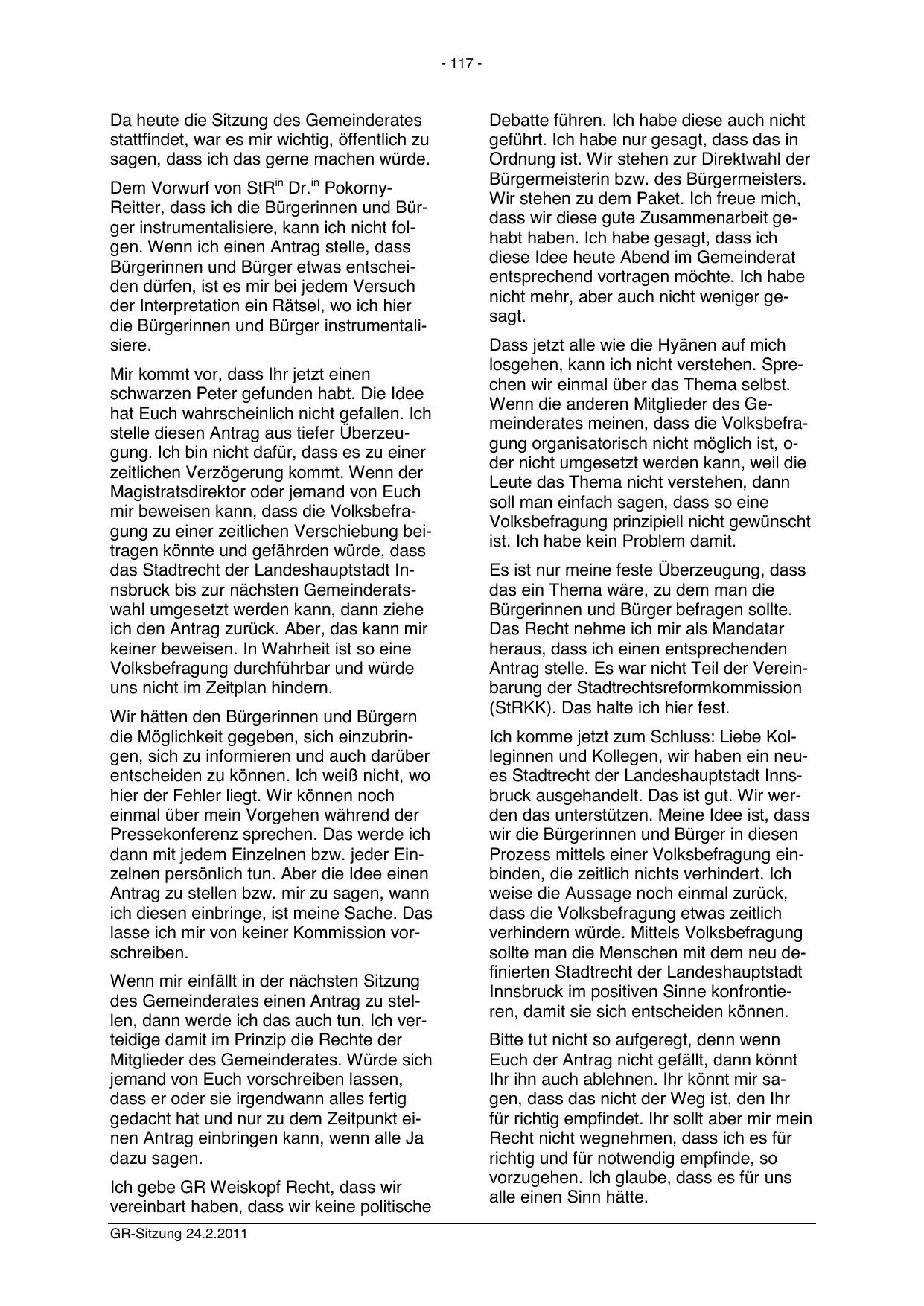 Ich komme jetzt zum Schluss: Liebe Kolleginnen und Kollegen, wir haben ein neues Stadtrecht der Landeshauptstadt Innsbruck ausgehandelt. Das ist gut. Wir werden das unterstützen. Meine Idee ist, dass