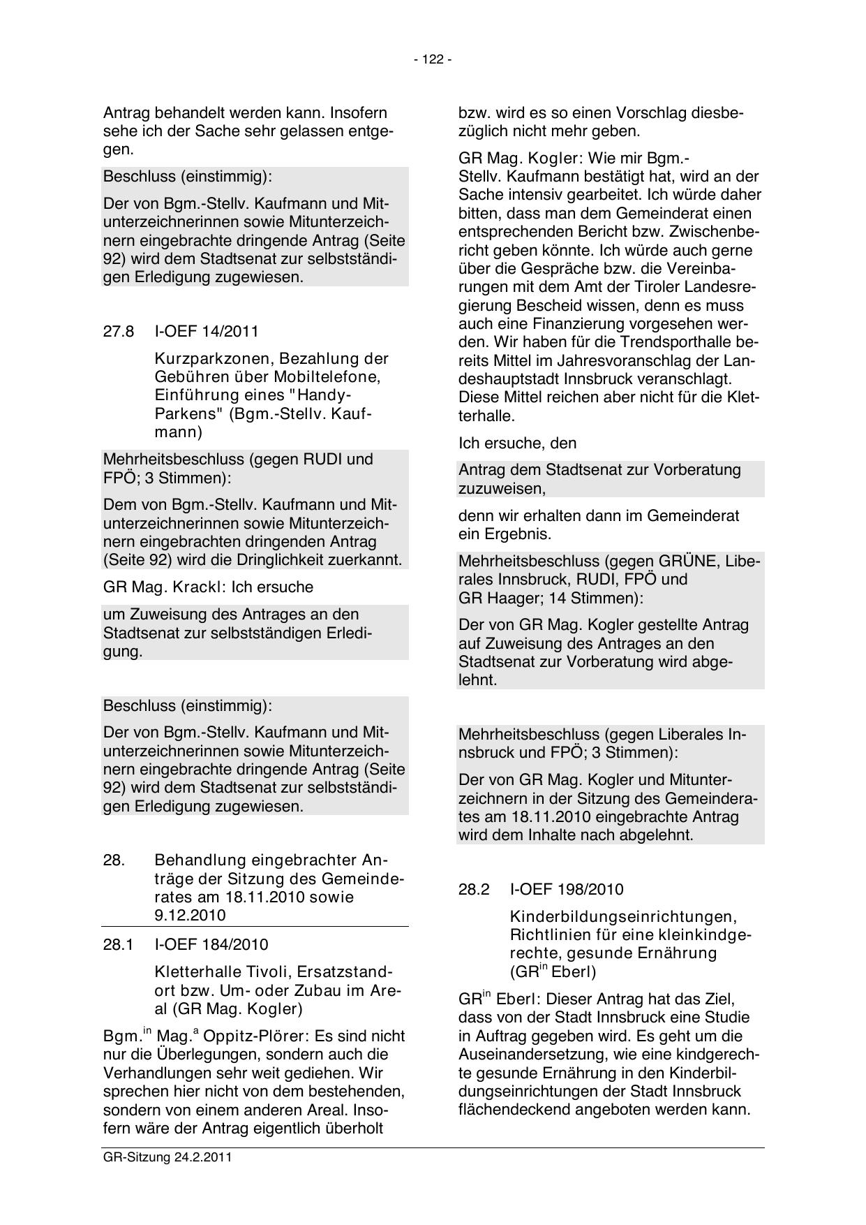 Der von GR Mag. Kogler und Mitunterzeichnern in der Sitzung des Gemeinderates am 18.11.2010 eingebrachte Antrag