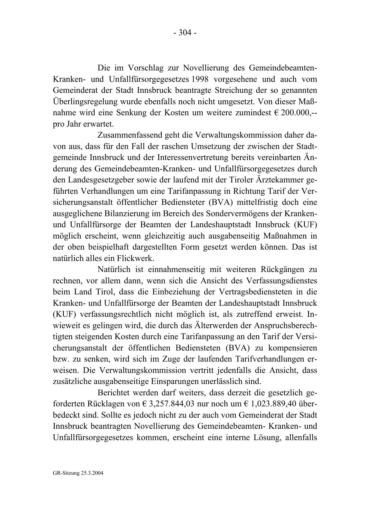 Zusammenfassend geht die Verwaltungskommission daher davon aus, dass für den Fall der raschen Umsetzung der zwischen der Stadtgemeinde Innsbruck und der Interessenvertretung bereits vereinbarten Änderung des Gemeindebeamten-Kranken- und Unfallfürsorgegesetzes durch