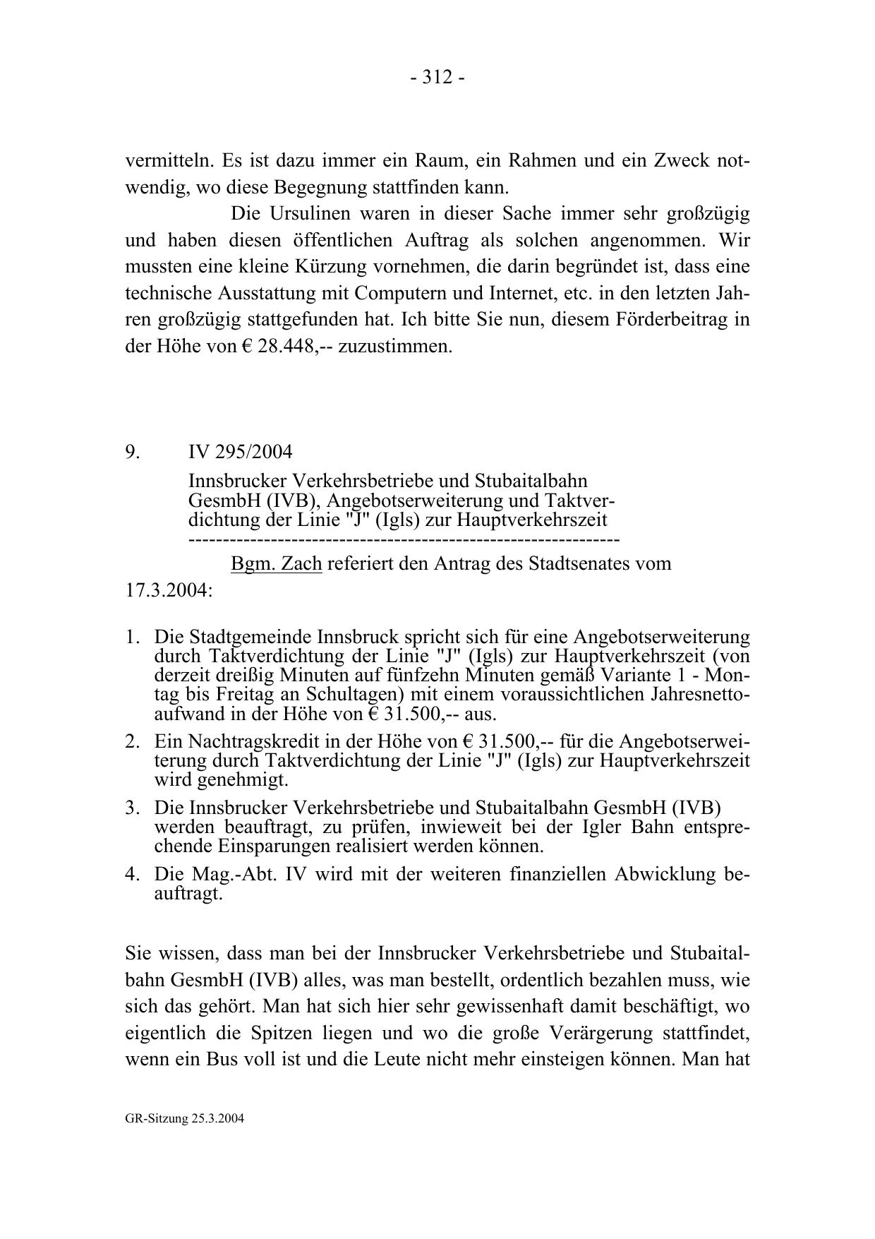 2. Ein Nachtragskredit in der Höhe von € 31.500,-- für die Angebotserweiterung durch Taktverdichtung der Linie "J" (Igls) zur Hauptverkehrszeit