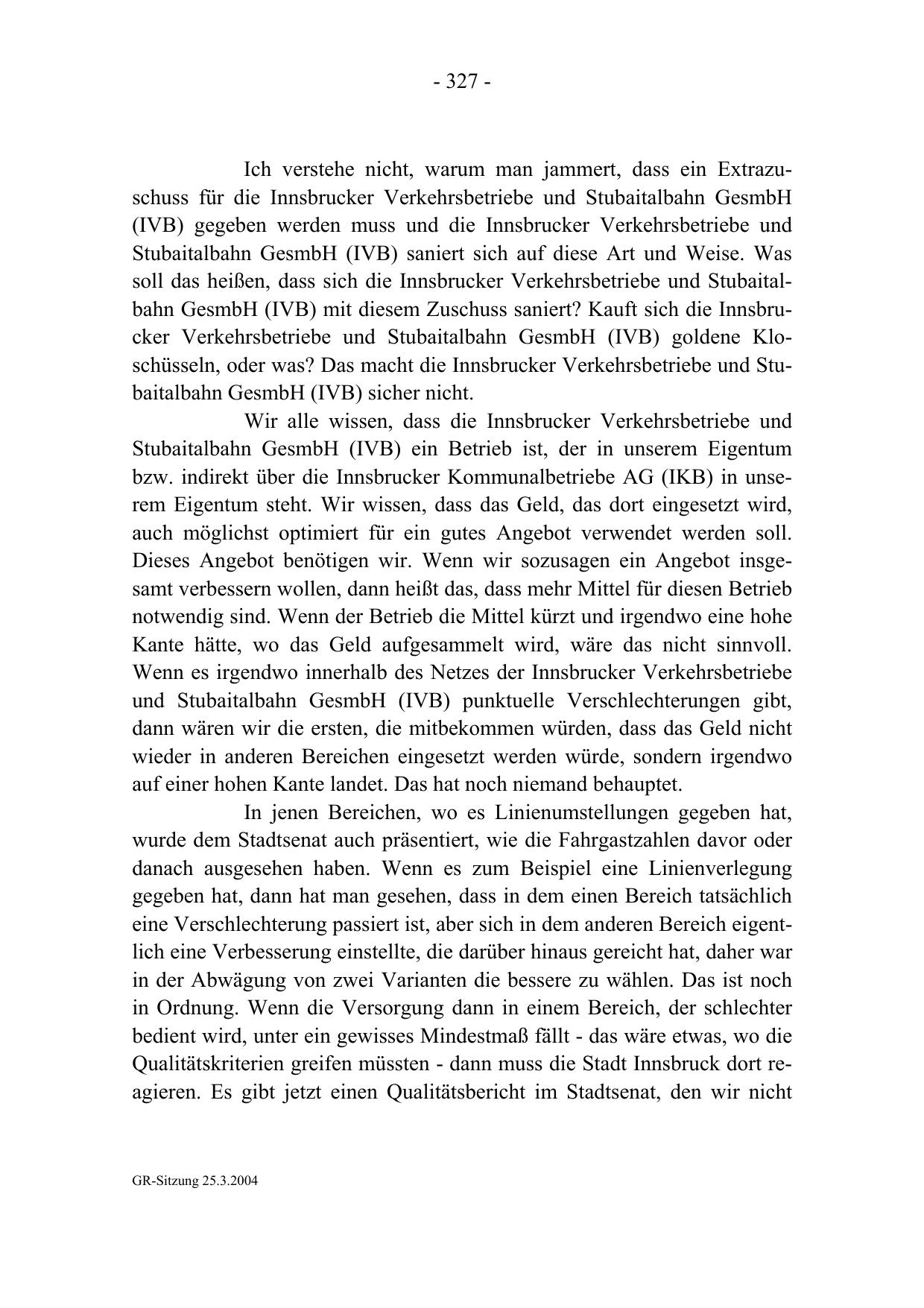 soll das heißen, dass sich die Innsbrucker Verkehrsbetriebe und Stubaitalbahn GesmbH (IVB) mit diesem Zuschuss saniert? Kauft sich die Innsbrucker Verkehrsbetriebe und Stubaitalbahn GesmbH (IVB) goldene Kloschüsseln, oder was? Das macht die Innsbrucker Verkehrsbetriebe und Stubaitalbahn GesmbH (IVB) sicher nicht.