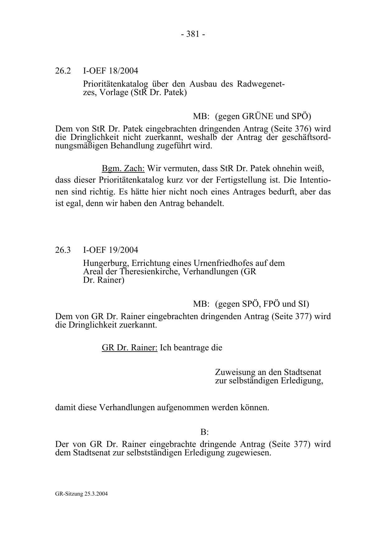 Der von GR Dr. Rainer eingebrachte dringende Antrag (Seite 377) wird