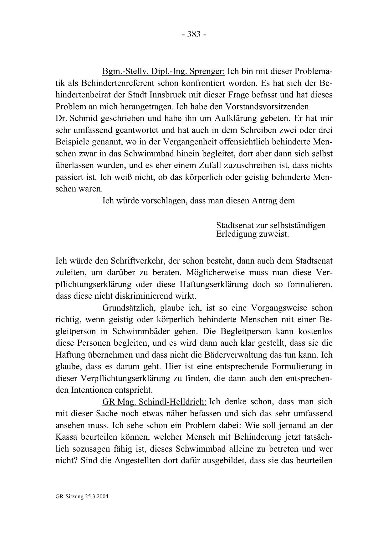 Bgm.-Stellv. Dipl.-Ing. Sprenger: Ich bin mit dieser Problematik als Behindertenreferent schon konfrontiert worden. Es hat sich der Behindertenbeirat der Stadt Innsbruck mit dieser Frage befasst und hat dieses