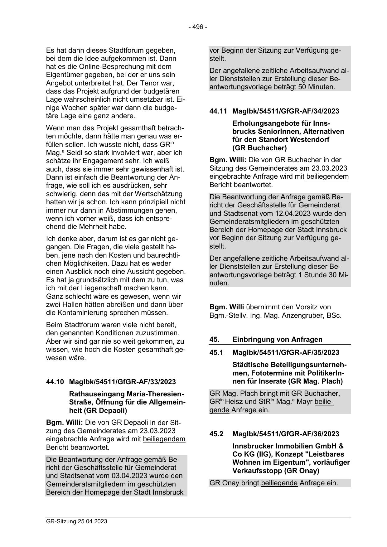 Bgm. Willi: Die von GR Depaoli in der Sitzung des Gemeinderates am 23.03.2023