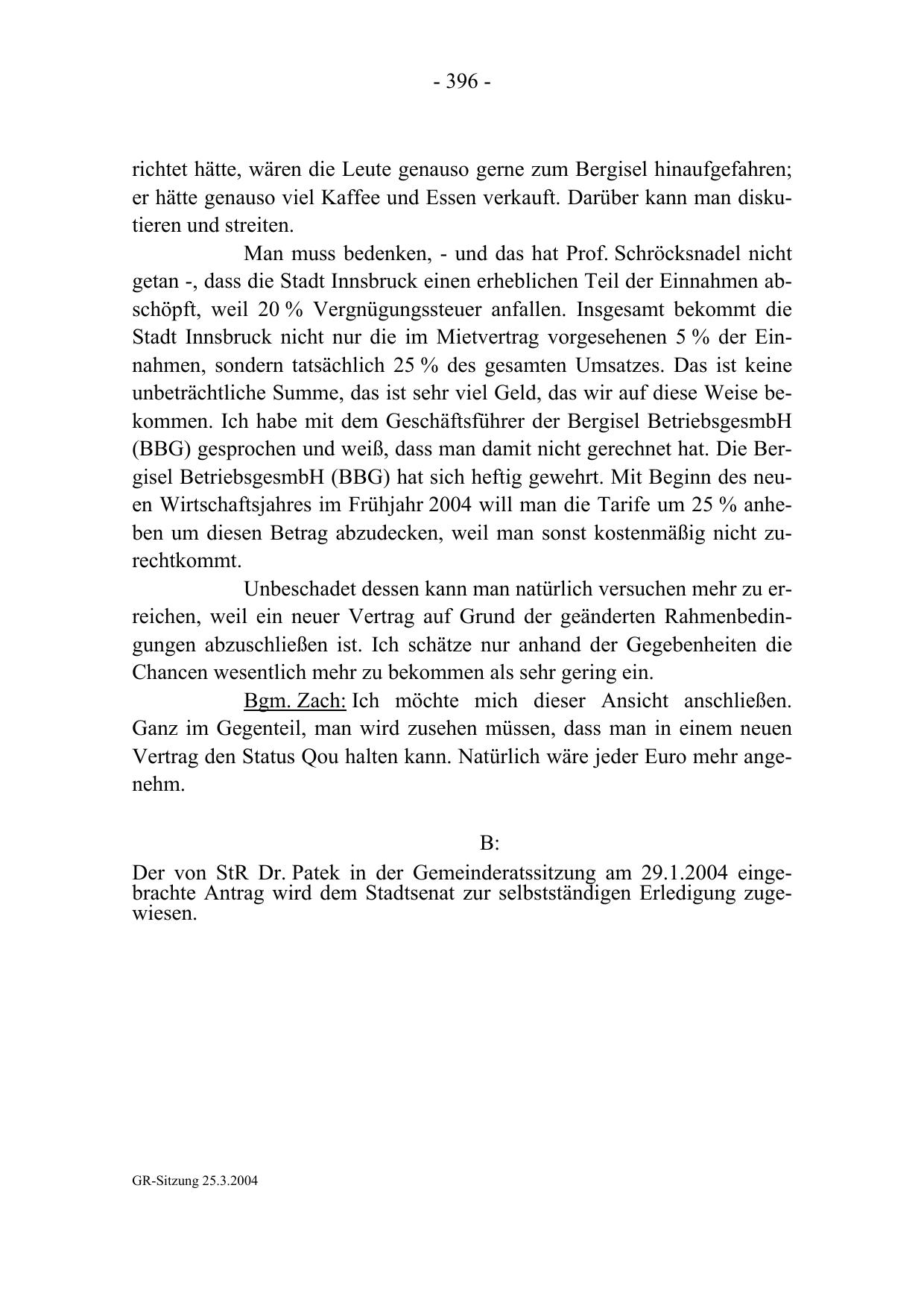 (BBG) gesprochen und weiß, dass man damit nicht gerechnet hat. Die Bergisel BetriebsgesmbH (BBG) hat sich heftig gewehrt. Mit Beginn des neuen Wirtschaftsjahres im Frühjahr 2004 will man die Tarife um 25 % anheben um diesen Betrag abzudecken, weil man sonst kostenmäßig nicht zurechtkommt.
