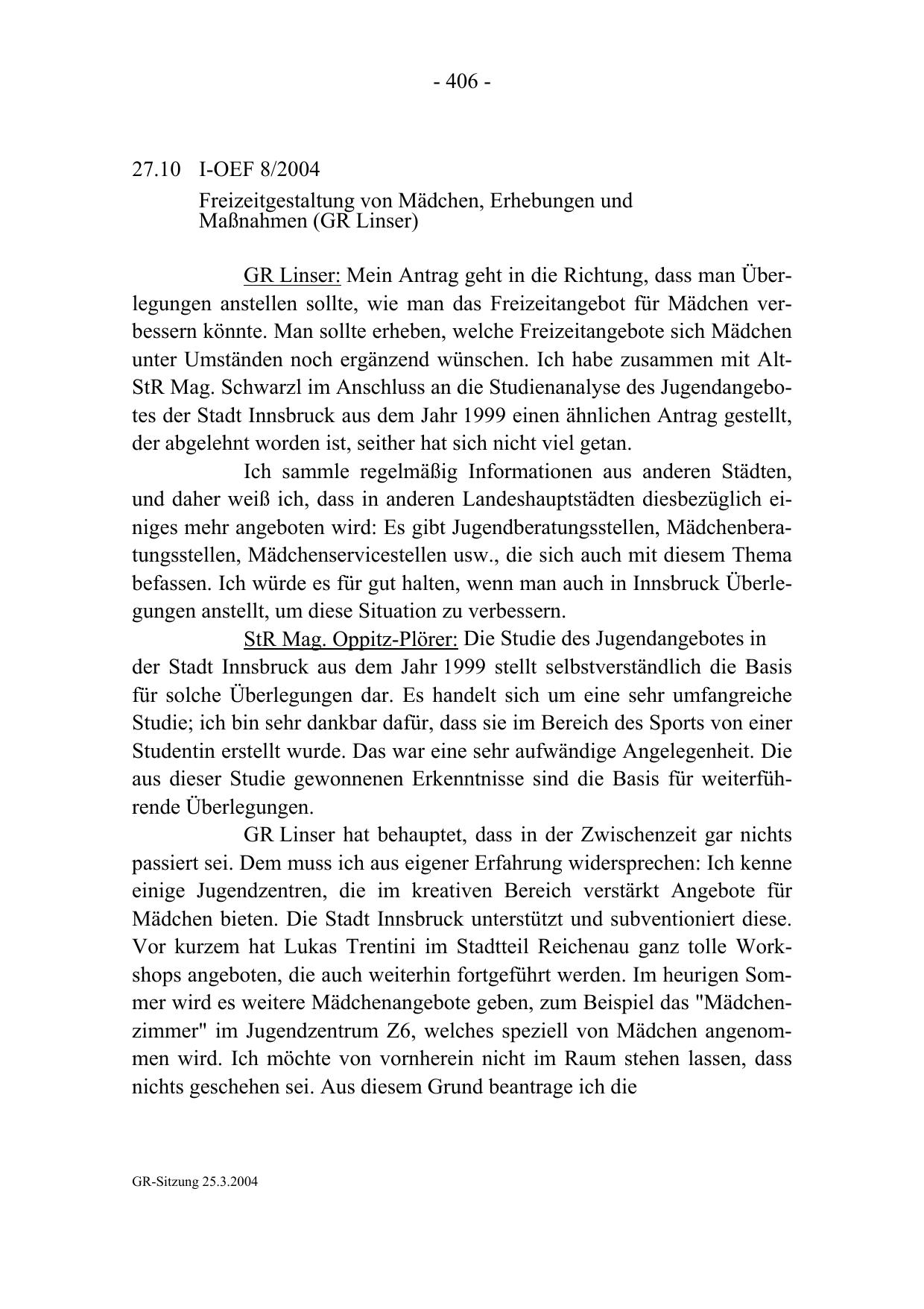 unter Umständen noch ergänzend wünschen. Ich habe zusammen mit AltStR Mag. Schwarzl im Anschluss an die Studienanalyse des Jugendangebotes der Stadt Innsbruck aus dem Jahr 1999 einen ähnlichen Antrag gestellt,
