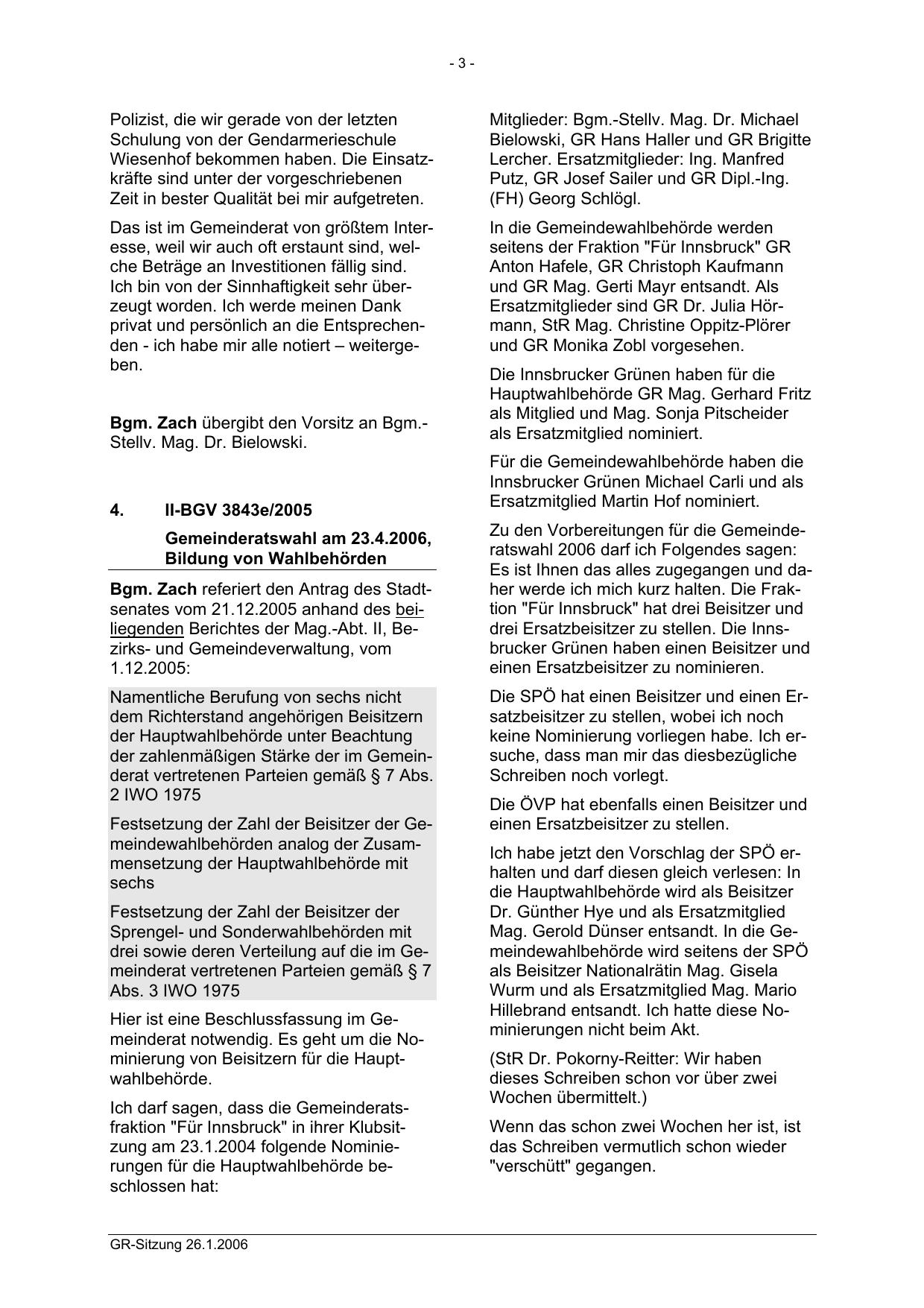Ich darf sagen, dass die Gemeinderatsfraktion "Für Innsbruck" in ihrer Klubsitzung am 23.1.2004 folgende Nominierungen für die Hauptwahlbehörde beschlossen hat: