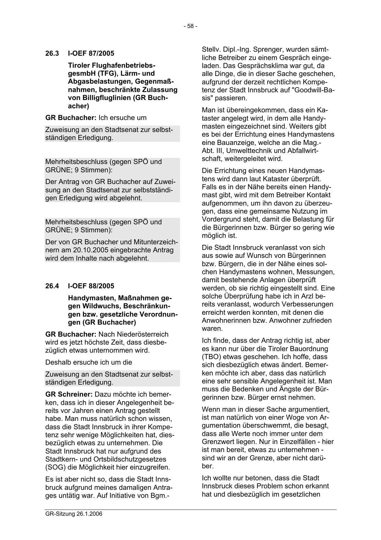 Es ist aber nicht so, dass die Stadt Innsbruck aufgrund meines damaligen Antrages untätig war. Auf Initiative von Bgm.GR-Sitzung 26.1.2006
