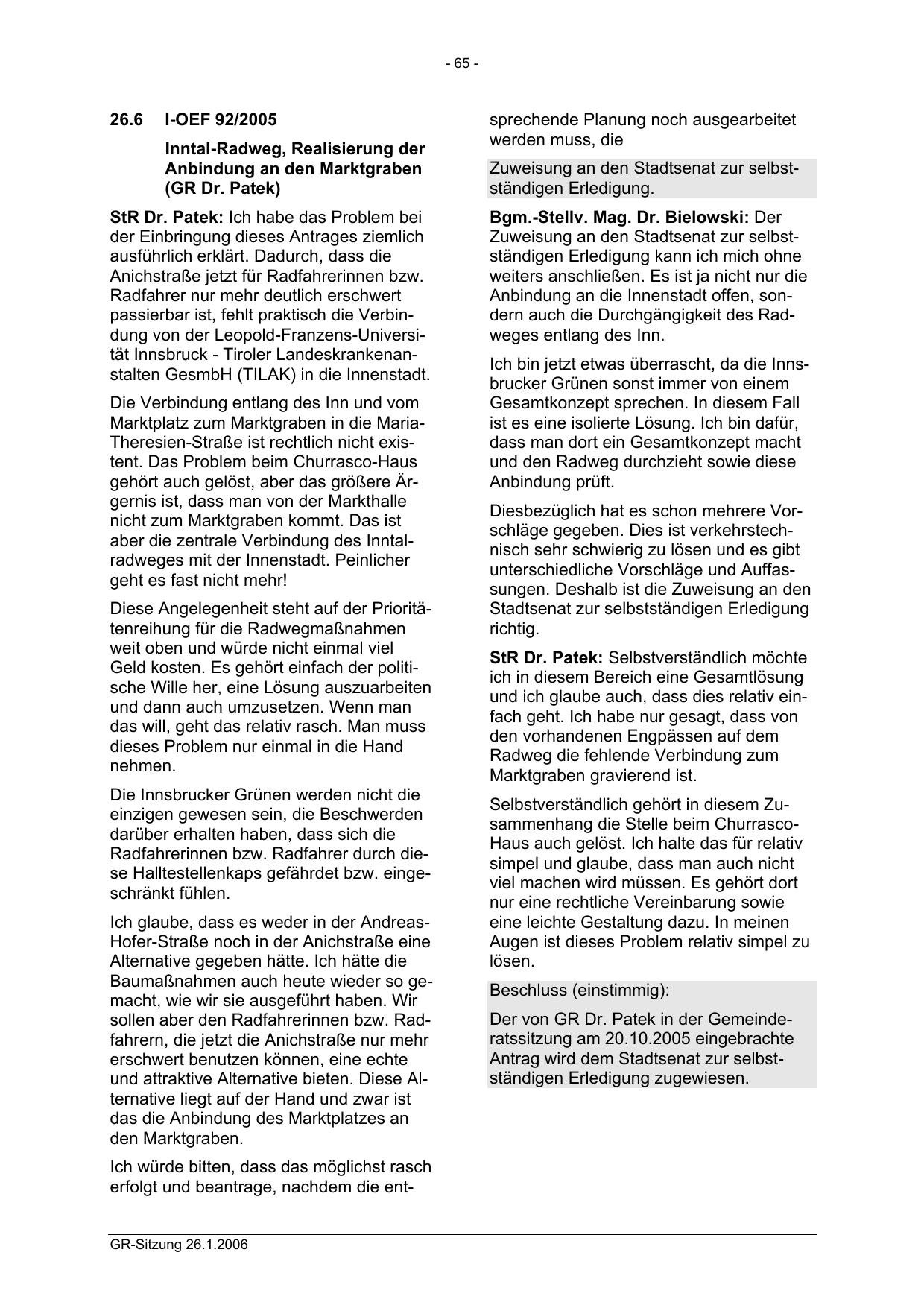 Der von GR Dr. Patek in der Gemeinderatssitzung am 20.10.2005 eingebrachte