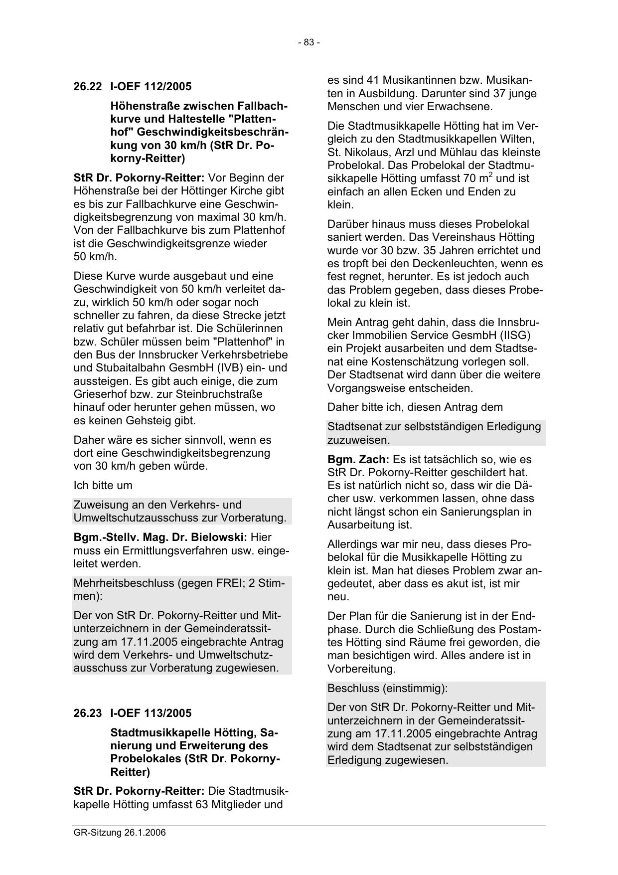 Der von StR Dr. Pokorny-Reitter und Mitunterzeichnern in der Gemeinderatssitzung am 17.11.2005 eingebrachte Antrag
