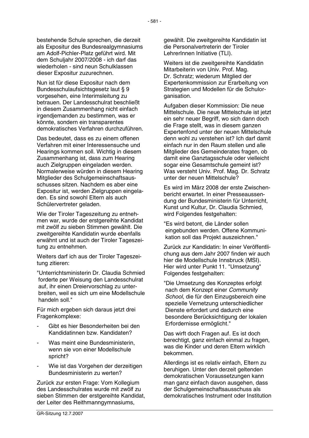 auf, ihr einen Dreiervorschlag zu unterbreiten, weil es sich um eine Modellschule