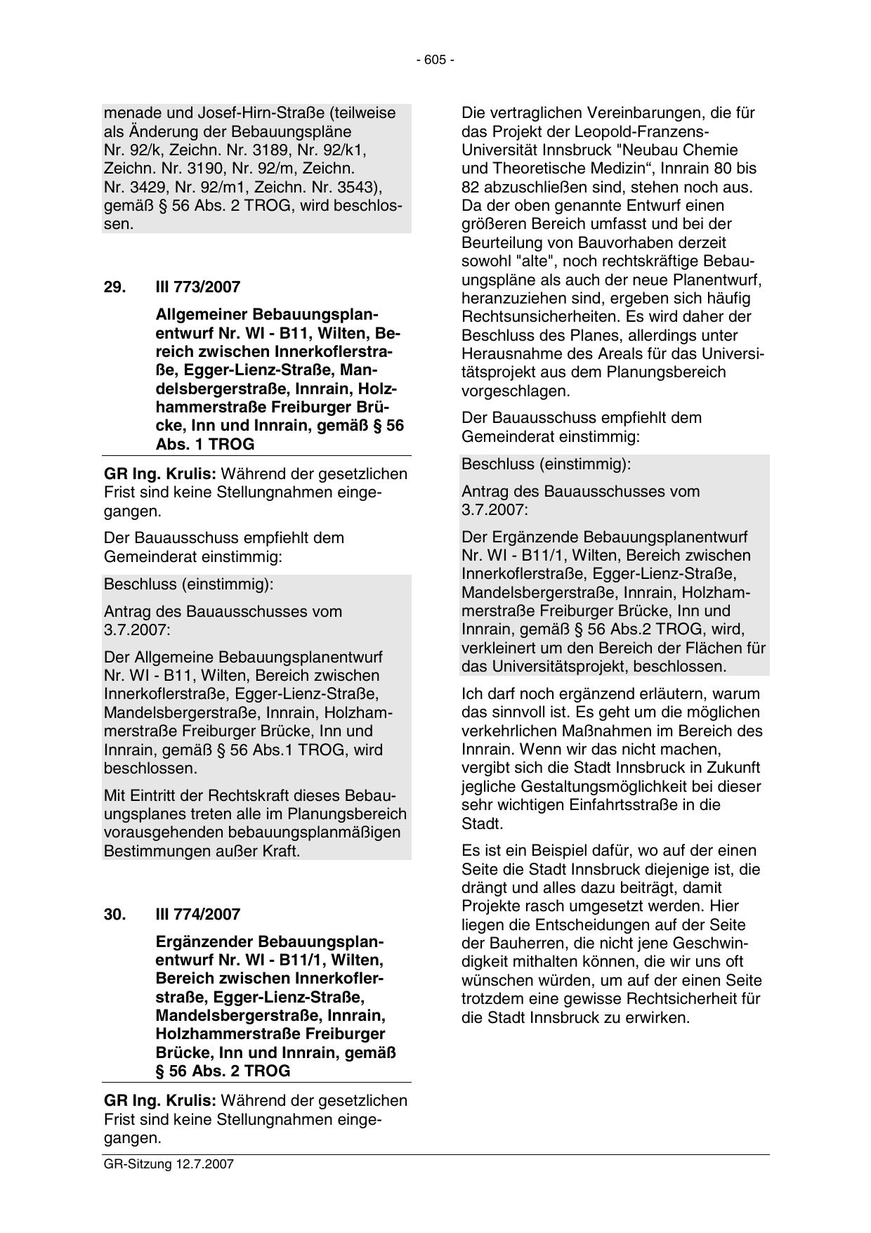 Allgemeiner Bebauungsplanentwurf Nr. WI - B11, Wilten, Bereich zwischen Innerkoflerstraße, Egger-Lienz-Straße, Mandelsbergerstraße, Innrain, Holzhammerstraße Freiburger Brücke, Inn und Innrain, gemäß § 56