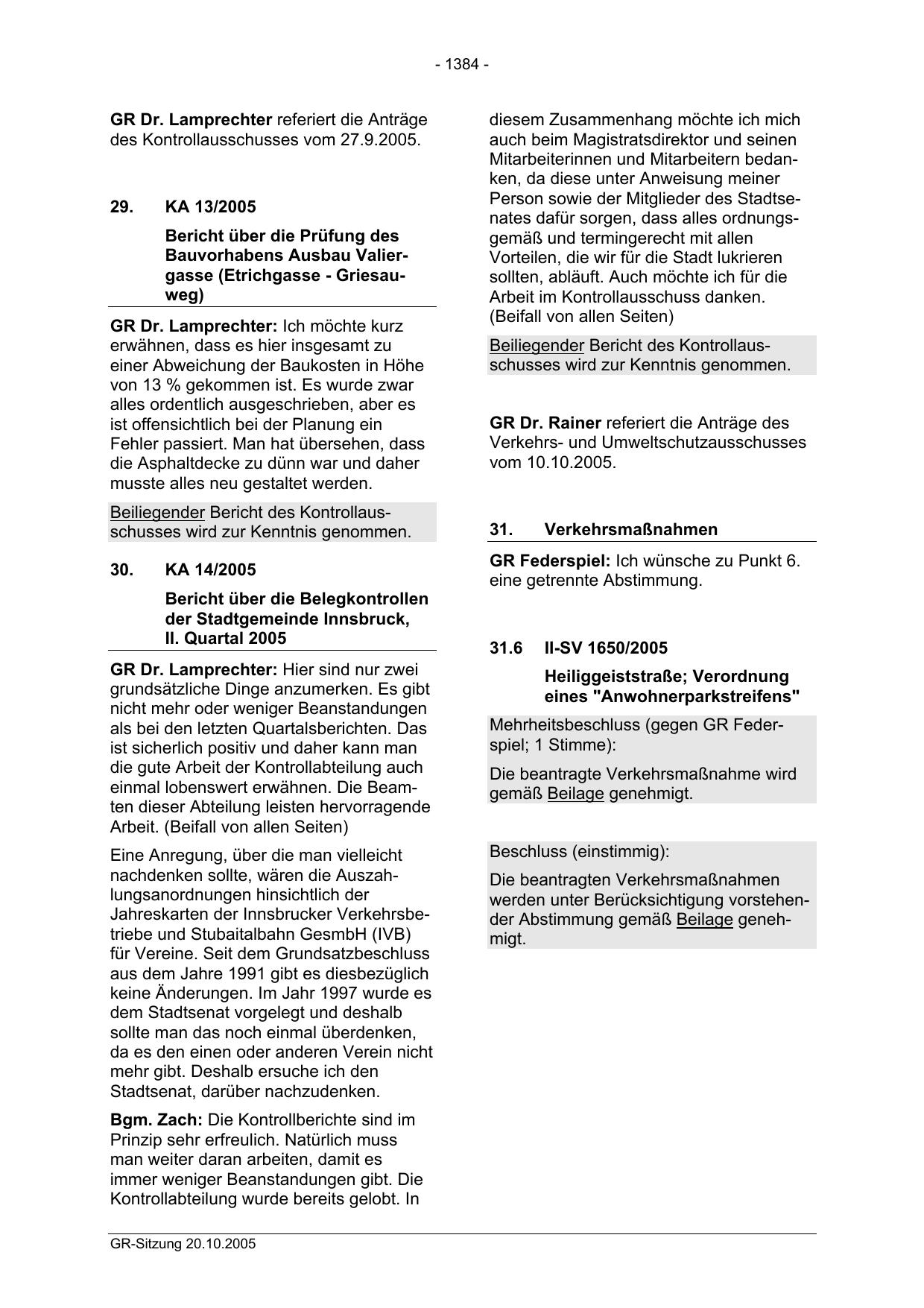 Mehrheitsbeschluss (gegen GR Federspiel; 1 Stimme):