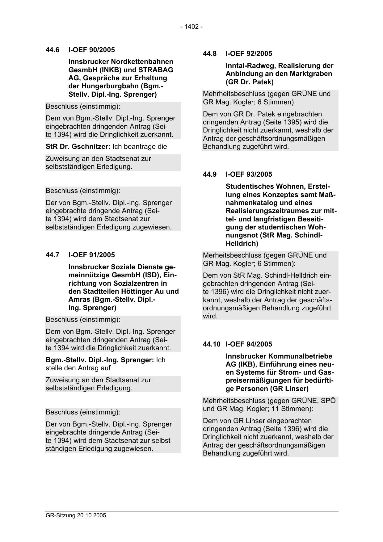Dem von StR Mag. Schindl-Helldrich eingebrachten dringenden Antrag (Seite 1396) wird die Dringlichkeit nicht zuerkannt, weshalb der Antrag der geschäftsordnungsmäßigen Behandlung zugeführt