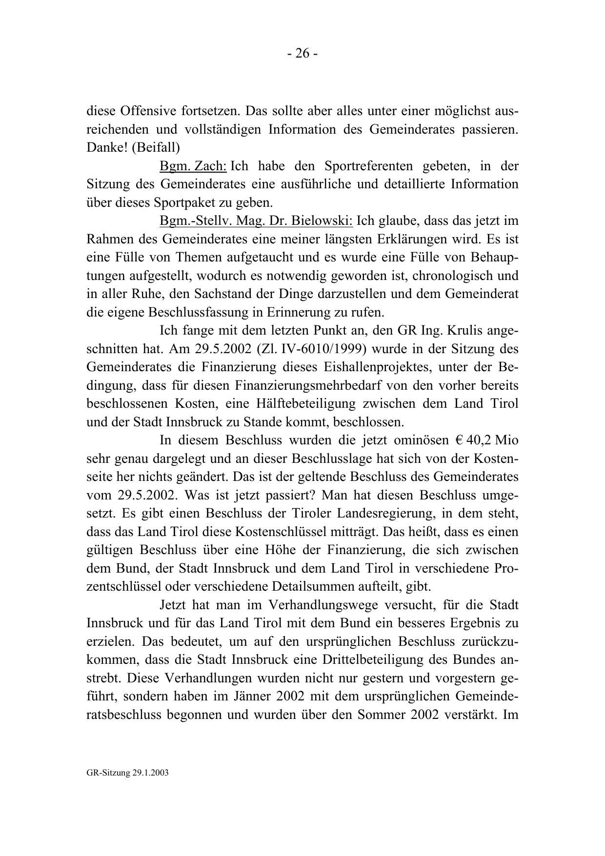erzielen. Das bedeutet, um auf den ursprünglichen Beschluss zurückzukommen, dass die Stadt Innsbruck eine Drittelbeteiligung des Bundes anstrebt. Diese Verhandlungen wurden nicht nur gestern und vorgestern geführt, sondern haben im Jänner 2002 mit dem ursprünglichen Gemeinderatsbeschluss begonnen und wurden über den Sommer 2002 verstärkt. Im
