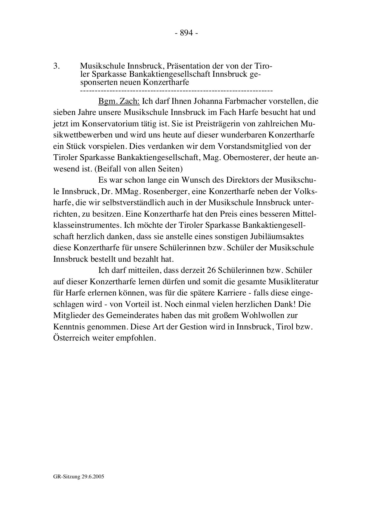Es war schon lange ein Wunsch des Direktors der Musikschule Innsbruck, Dr. MMag. Rosenberger, eine Konzertharfe neben der Volksharfe, die wir selbstverständlich auch in der Musikschule Innsbruck unterrichten, zu besitzen. Eine Konzertharfe hat den Preis eines besseren Mittelklasseinstrumentes. Ich möchte der Tiroler Sparkasse Bankaktiengesellschaft herzlich danken, dass sie anstelle eines sonstigen Jubiläumsaktes