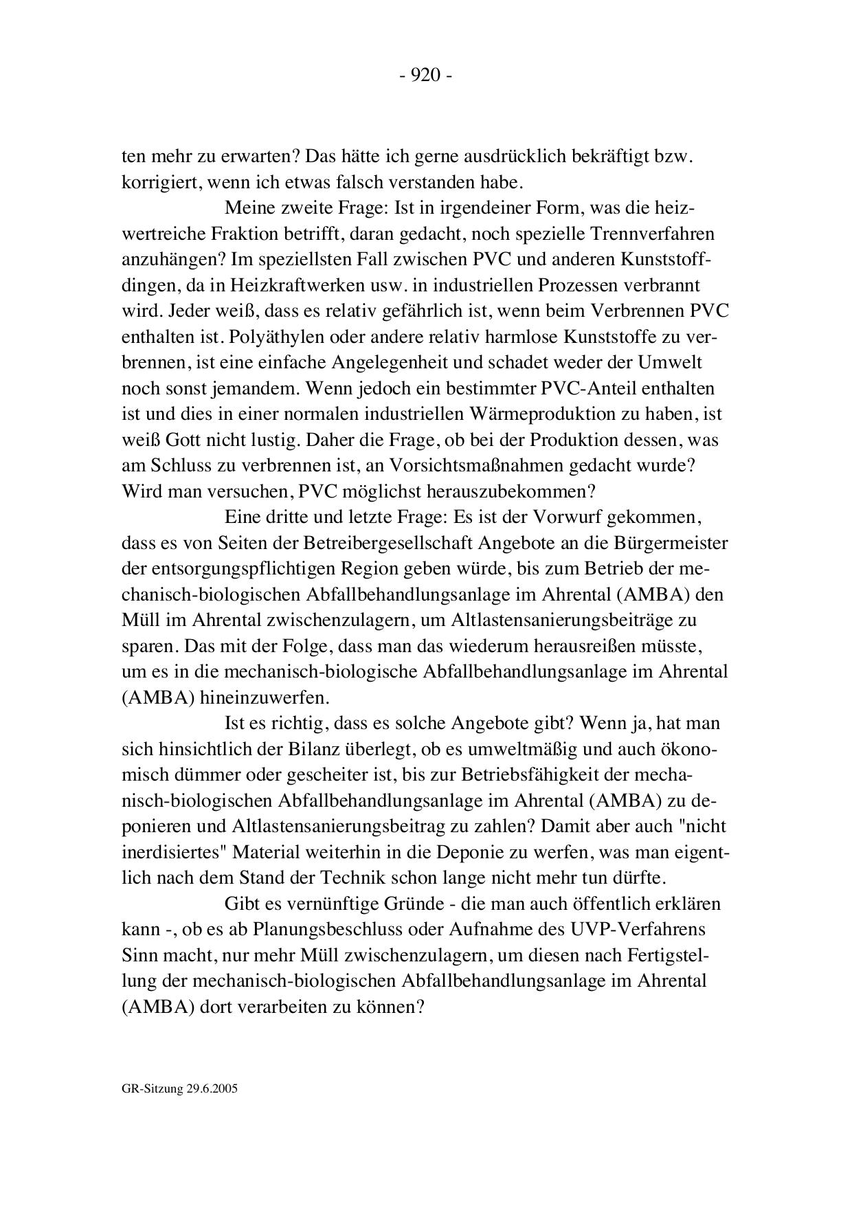 sich hinsichtlich der Bilanz überlegt, ob es umweltmäßig und auch ökonomisch dümmer oder gescheiter ist, bis zur Betriebsfähigkeit der mechanisch-biologischen Abfallbehandlungsanlage im Ahrental (AMBA) zu deponieren und Altlastensanierungsbeitrag zu zahlen? Damit aber auch "nicht