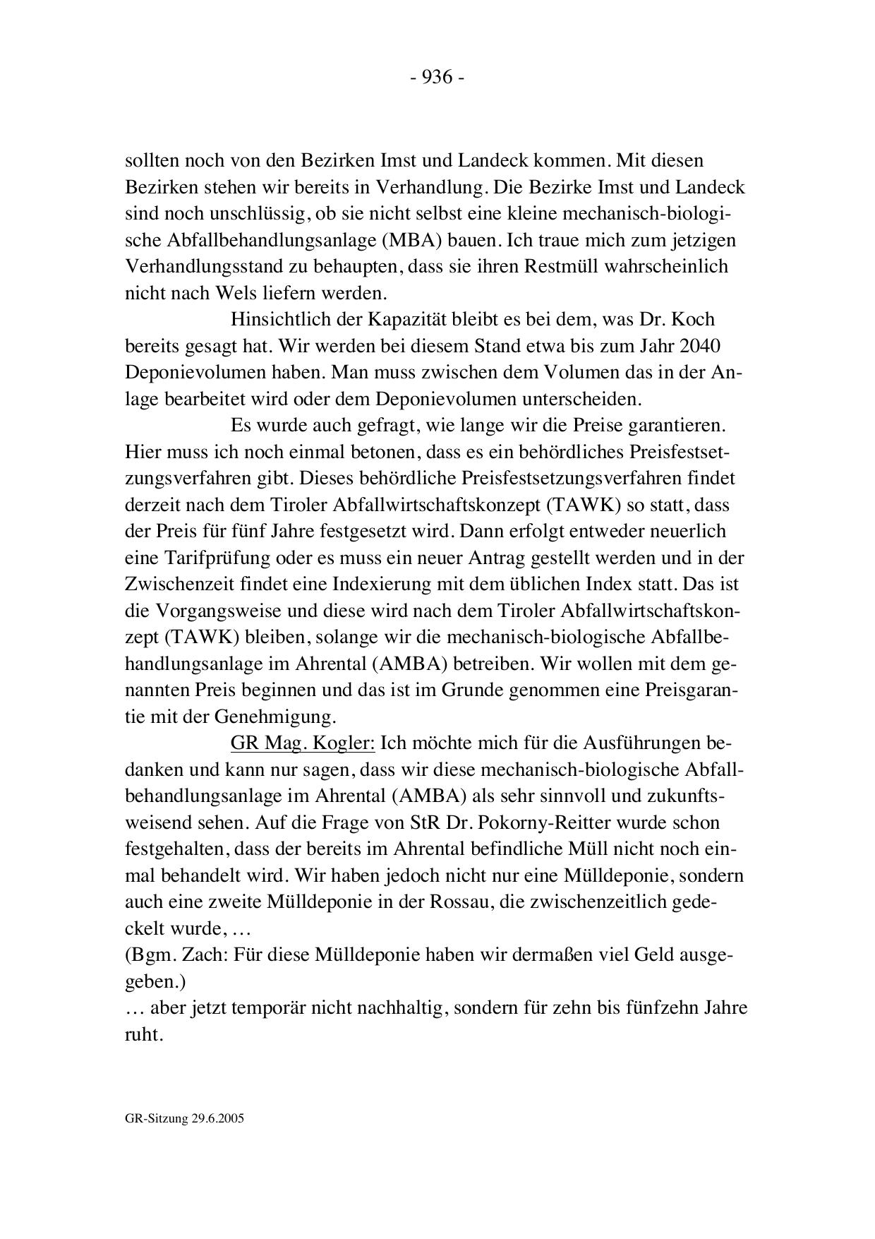 die Vorgangsweise und diese wird nach dem Tiroler Abfallwirtschaftskonzept (TAWK) bleiben, solange wir die mechanisch-biologische Abfallbehandlungsanlage im Ahrental (AMBA) betreiben. Wir wollen mit dem genannten Preis beginnen und das ist im Grunde genommen eine Preisgarantie mit der Genehmigung.