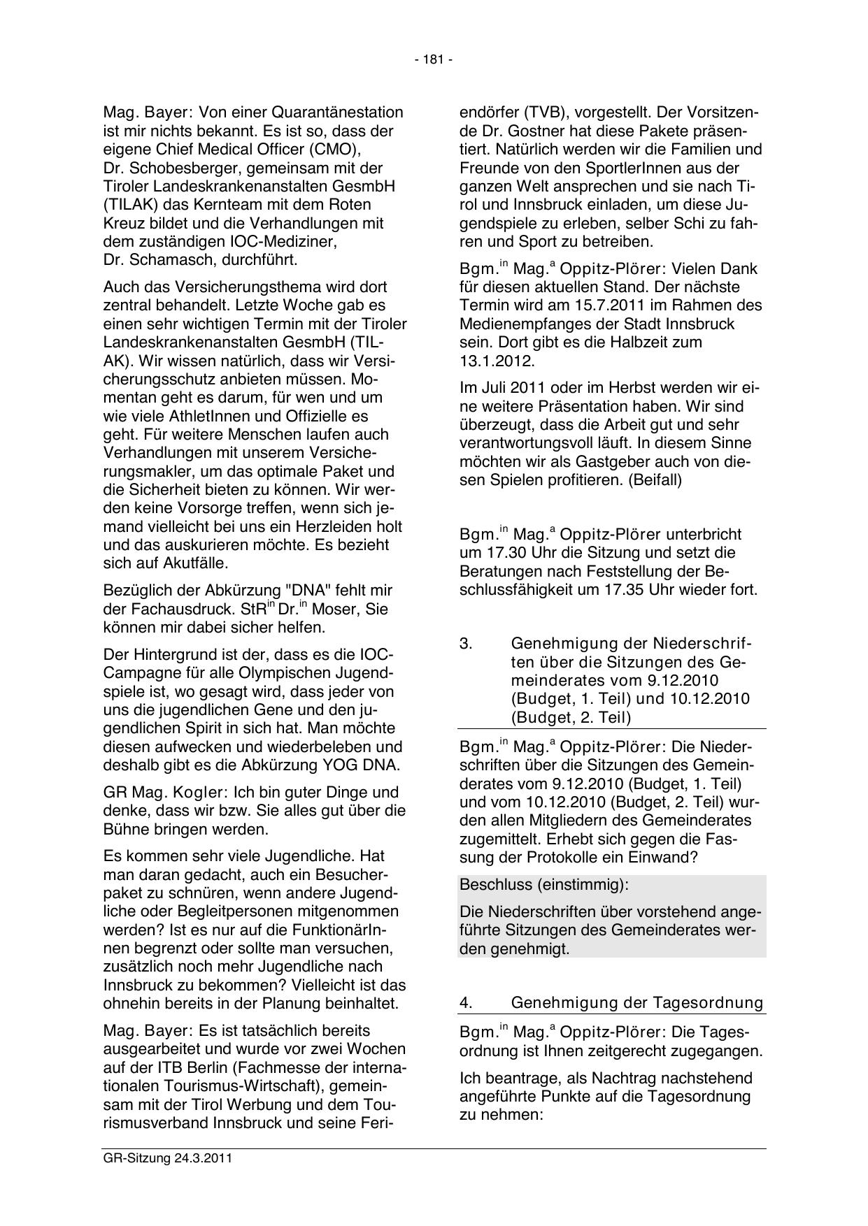 Bgm.in Mag.a Oppitz-Plörer: Die Niederschriften über die Sitzungen des Gemeinderates vom 9.12.2010 (Budget, 1. Teil)