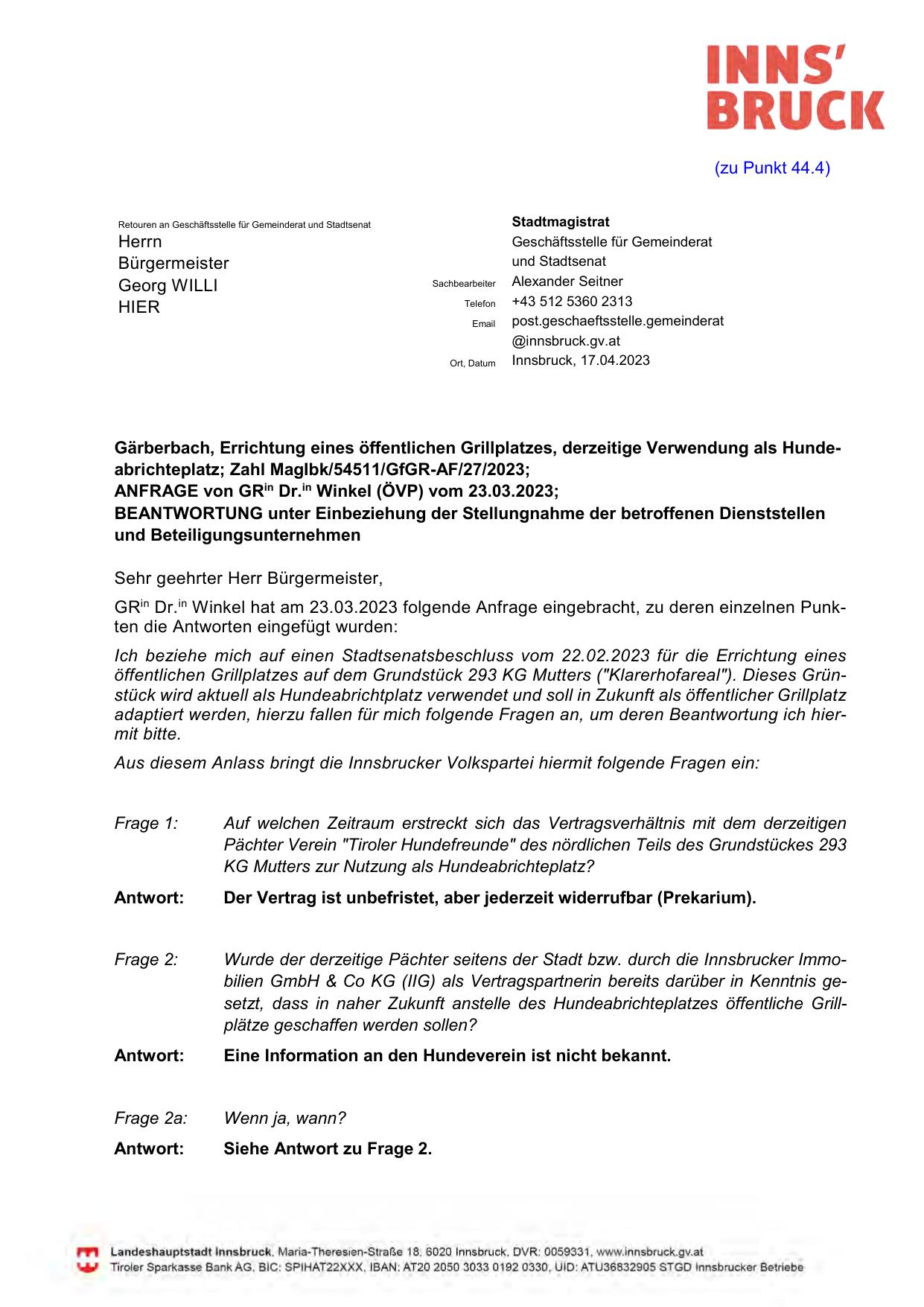 Wurde der derzeitige Pächter seitens der Stadt bzw. durch die Innsbrucker Immobilien GmbH & Co KG (IIG) als Vertragspartnerin bereits darüber in Kenntnis gesetzt, dass in naher Zukunft anstelle des Hundeabrichteplatzes öffentliche Grillplätze geschaffen werden sollen?