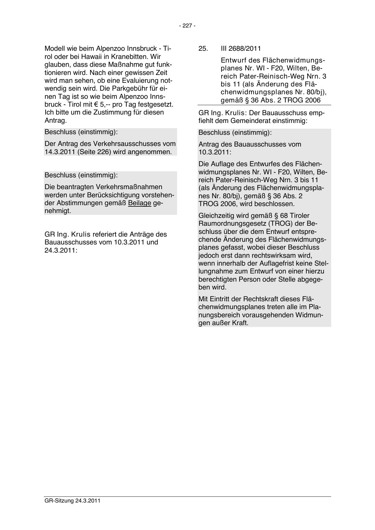 Raumordnungsgesetz (TROG) der Beschluss über die dem Entwurf entsprechende Änderung des Flächenwidmungsplanes gefasst, wobei dieser Beschluss