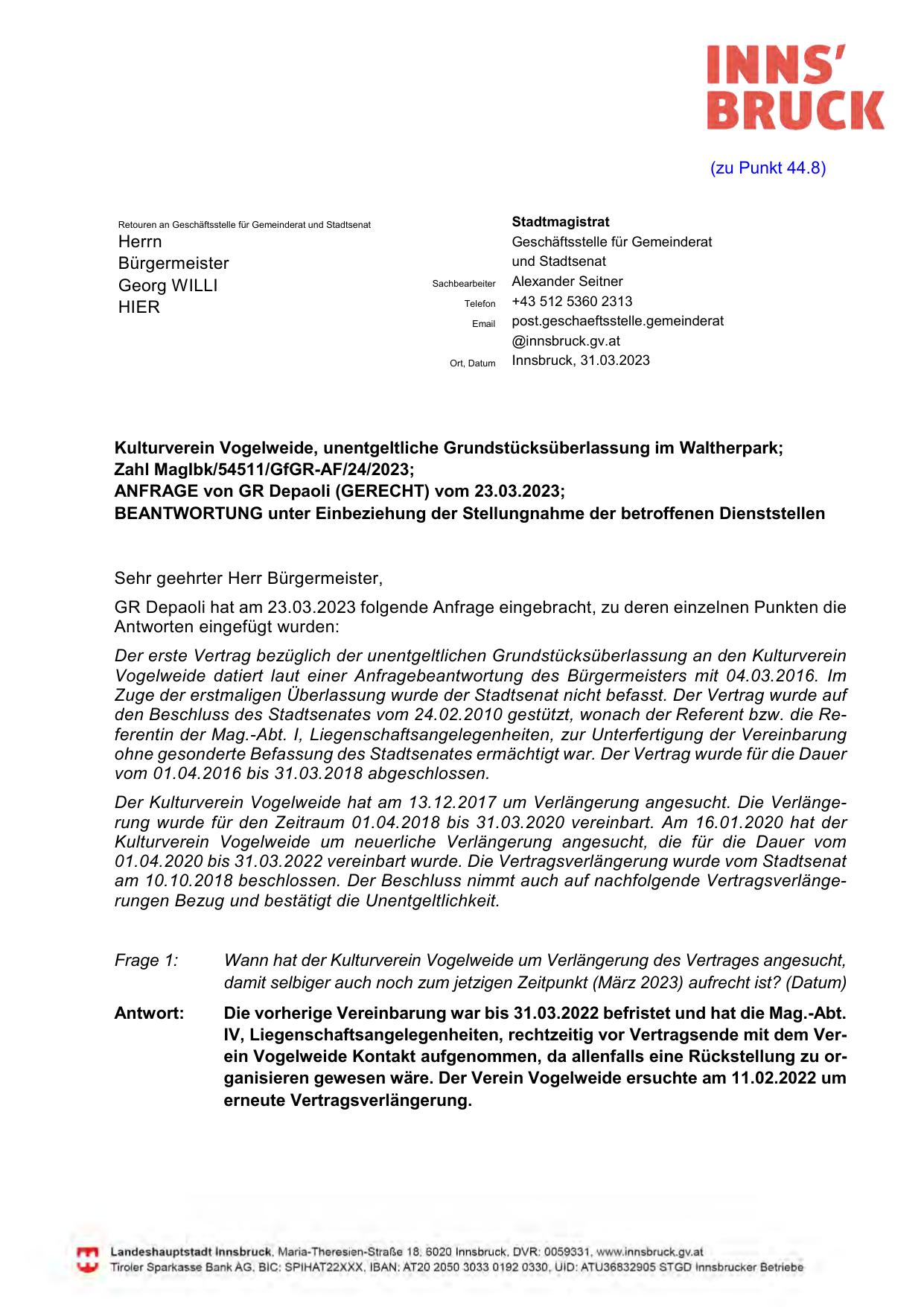 GR Depaoli hat am 23.03.2023 folgende Anfrage eingebracht, zu deren einzelnen Punkten die