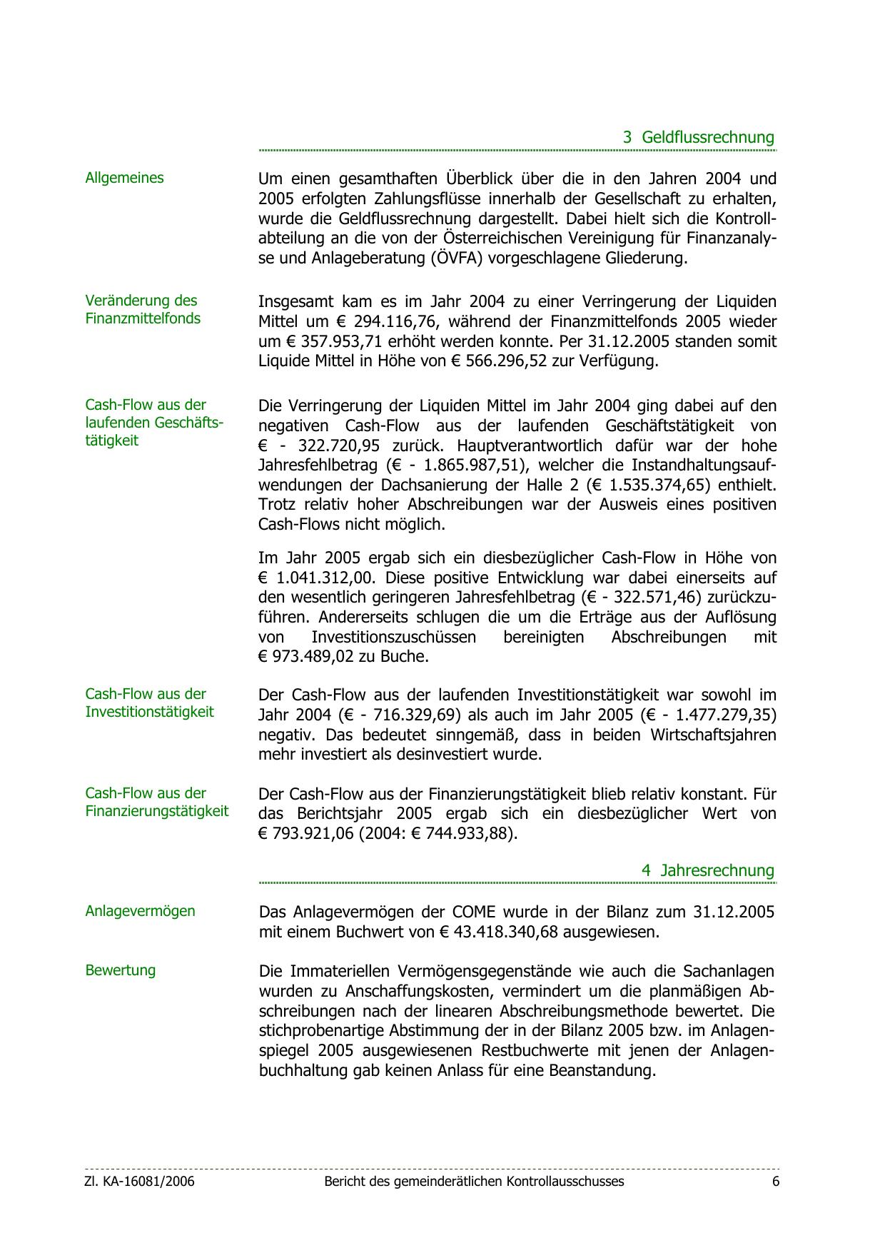 wurde die Geldflussrechnung dargestellt. Dabei hielt sich die Kontrollabteilung an die von der Österreichischen Vereinigung für Finanzanalyse und Anlageberatung (ÖVFA) vorgeschlagene Gliederung.
