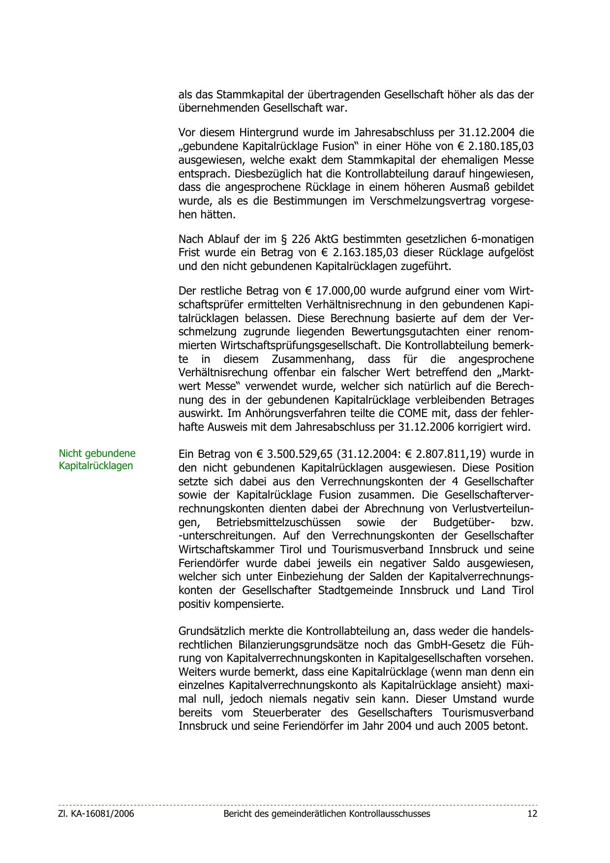 Der restliche Betrag von € 17.000,00 wurde aufgrund einer vom Wirtschaftsprüfer ermittelten Verhältnisrechnung in den gebundenen Kapitalrücklagen belassen. Diese Berechnung basierte auf dem der Verschmelzung zugrunde liegenden Bewertungsgutachten einer renommierten Wirtschaftsprüfungsgesellschaft. Die Kontrollabteilung bemerkte in diesem Zusammenhang, dass für die angesprochene