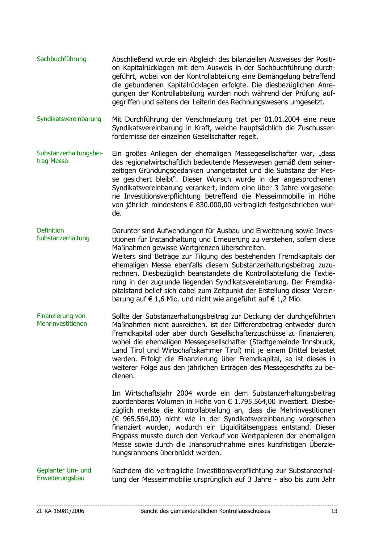 ehemaligen Messe ebenfalls diesem Substanzerhaltungsbeitrag zuzurechnen. Diesbezüglich beanstandete die Kontrollabteilung die Textierung in der zugrunde liegenden Syndikatsvereinbarung. Der Fremdkapitalstand belief sich dabei zum Zeitpunkt der Erstellung dieser Vereinbarung auf € 1,6 Mio. und nicht wie angeführt auf € 1,2 Mio.