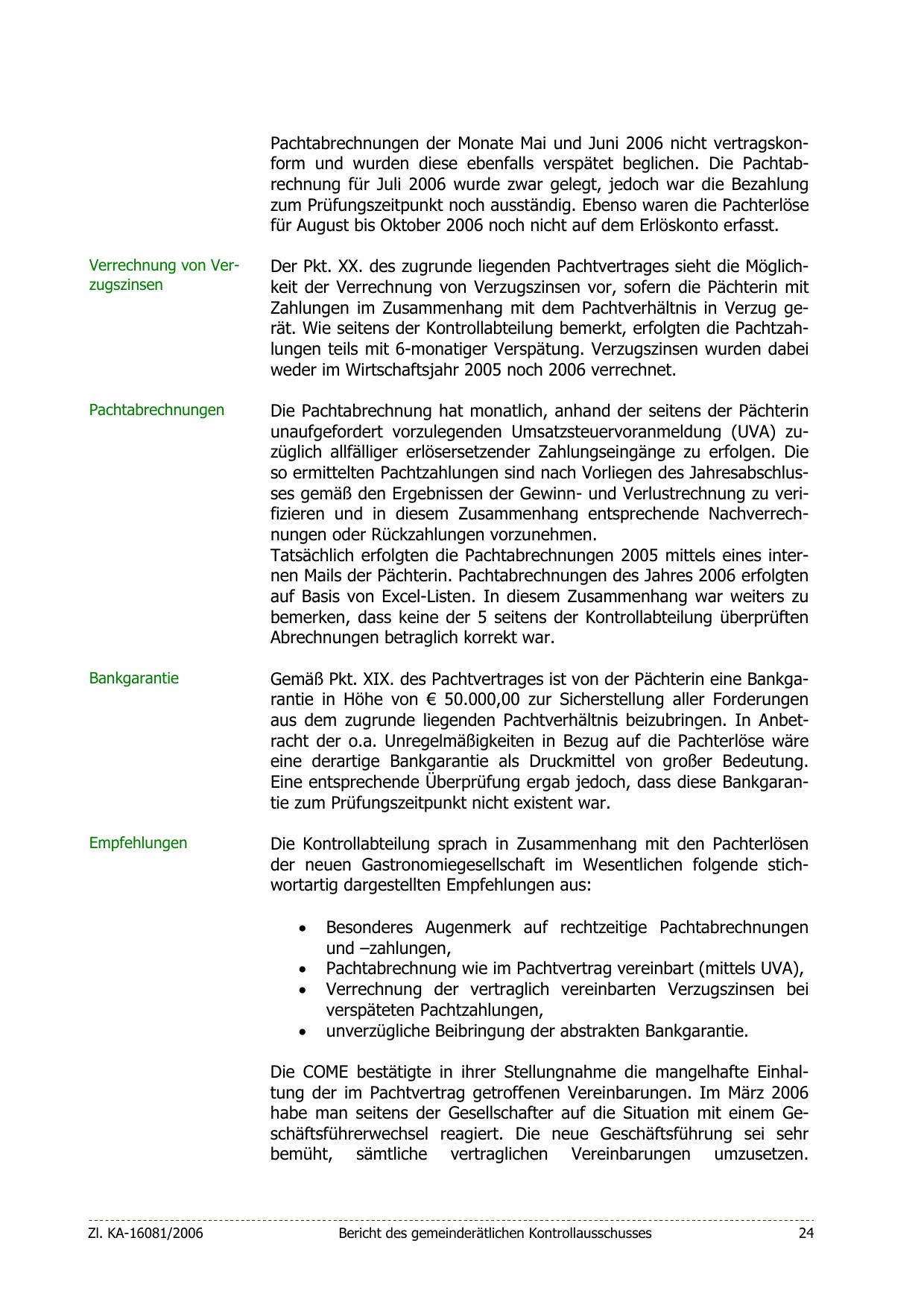 Die COME bestätigte in ihrer Stellungnahme die mangelhafte Einhaltung der im Pachtvertrag getroffenen Vereinbarungen. Im März 2006