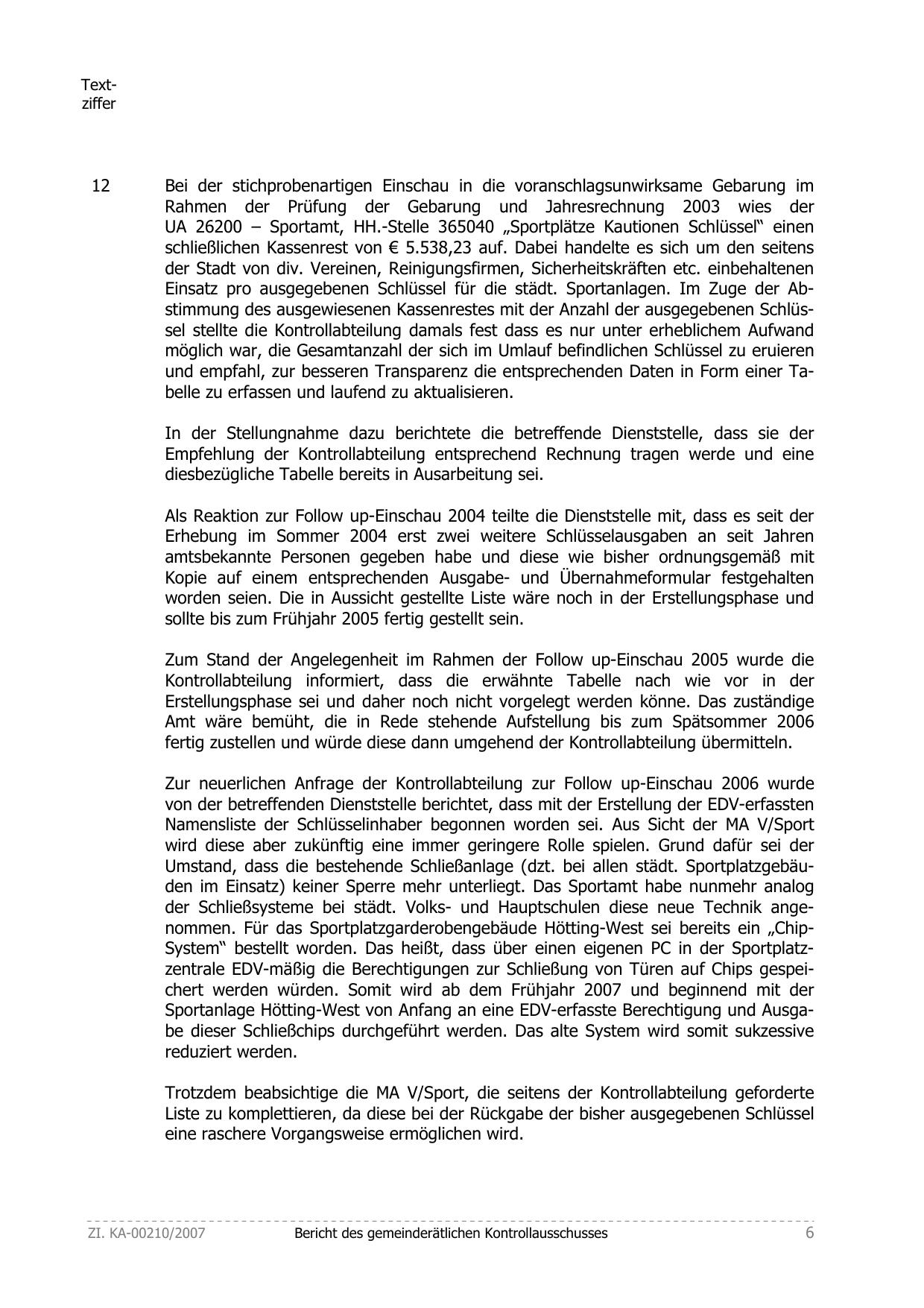 Einsatz pro ausgegebenen Schlüssel für die städt. Sportanlagen. Im Zuge der Abstimmung des ausgewiesenen Kassenrestes mit der Anzahl der ausgegebenen Schlüssel stellte die Kontrollabteilung damals fest dass es nur unter erheblichem Aufwand