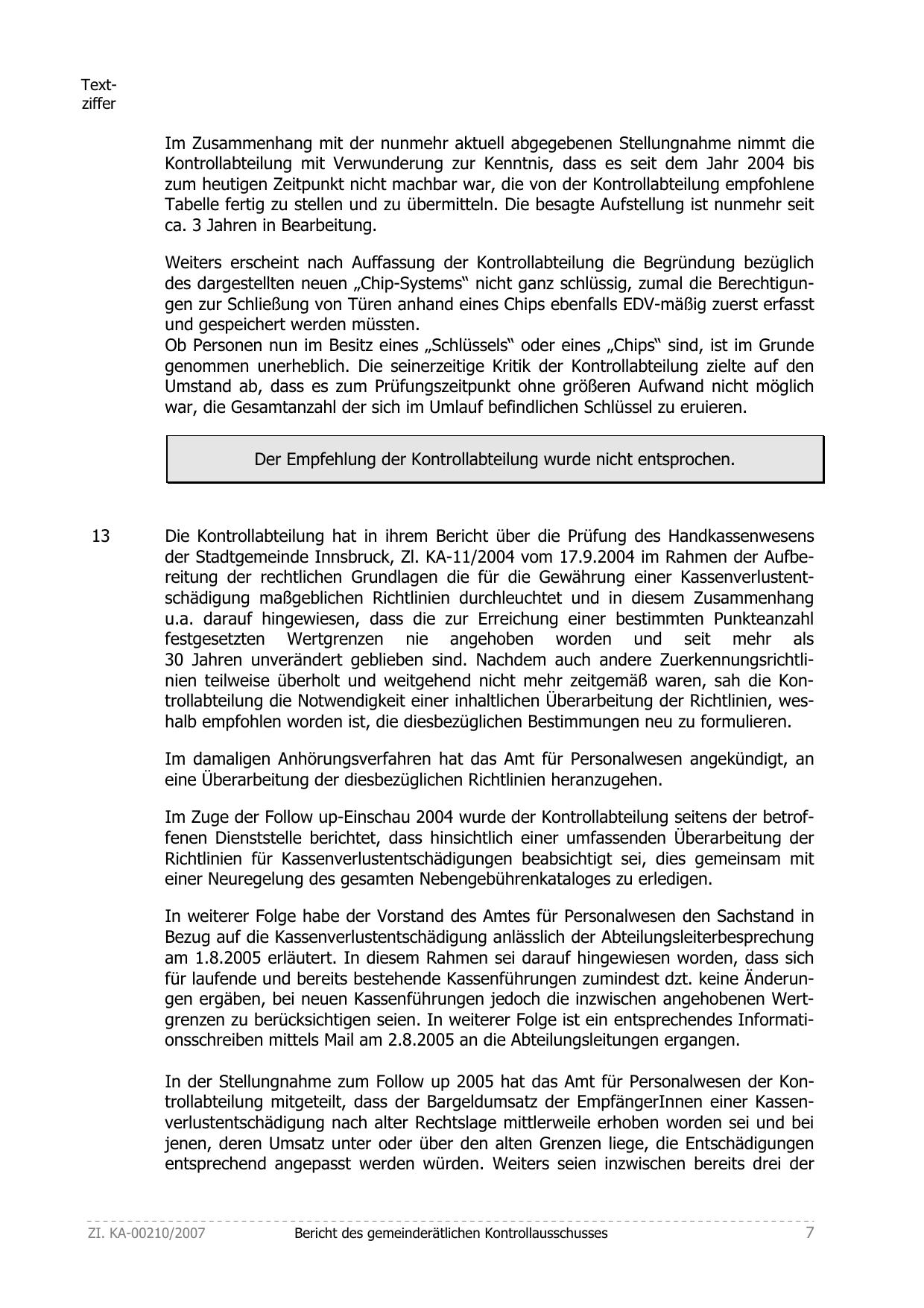der Stadtgemeinde Innsbruck, Zl. KA-11/2004 vom 17.9.2004 im Rahmen der Aufbereitung der rechtlichen Grundlagen die für die Gewährung einer Kassenverlustentschädigung maßgeblichen Richtlinien durchleuchtet und in diesem Zusammenhang
