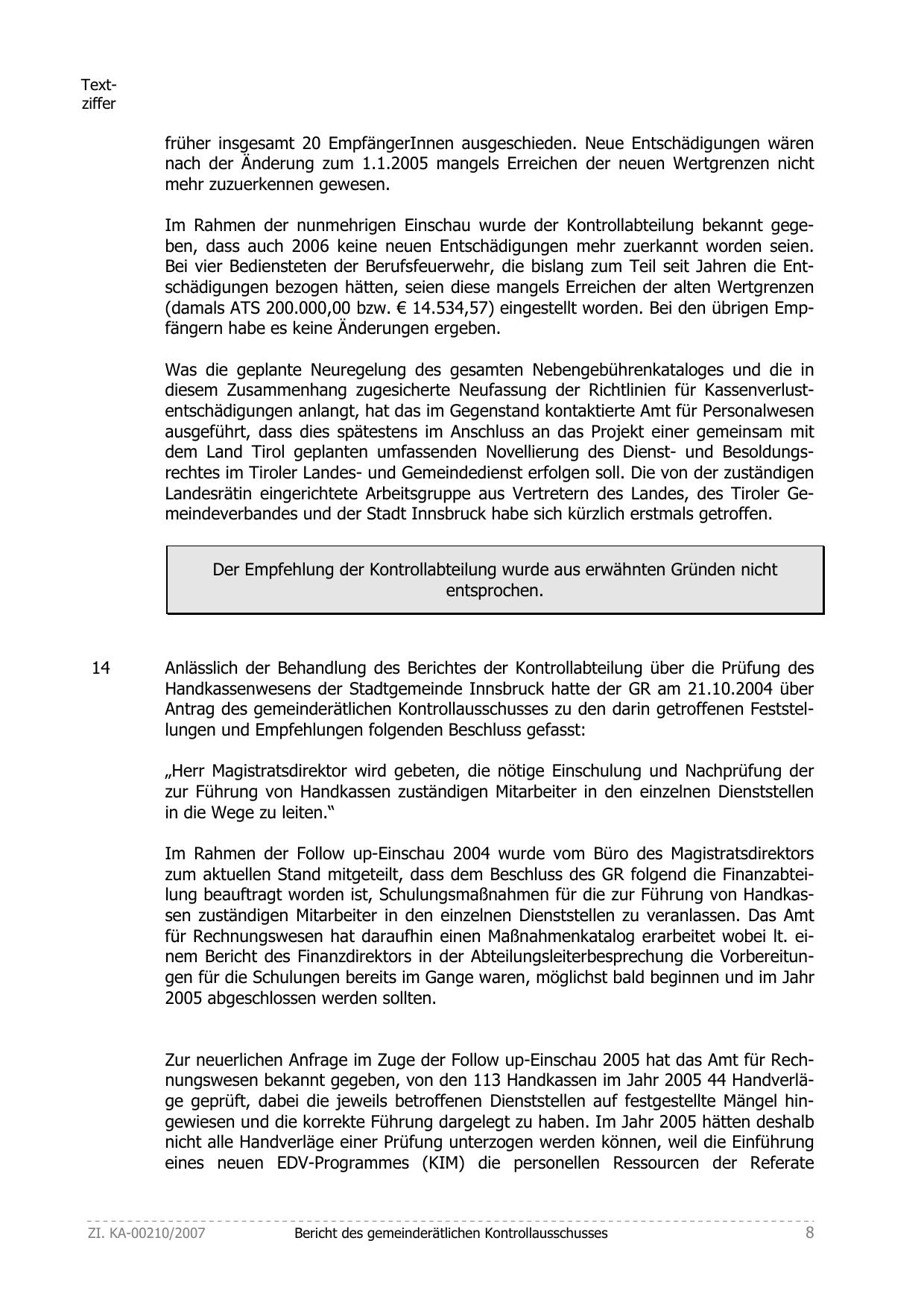 Handkassenwesens der Stadtgemeinde Innsbruck hatte der GR am 21.10.2004 über