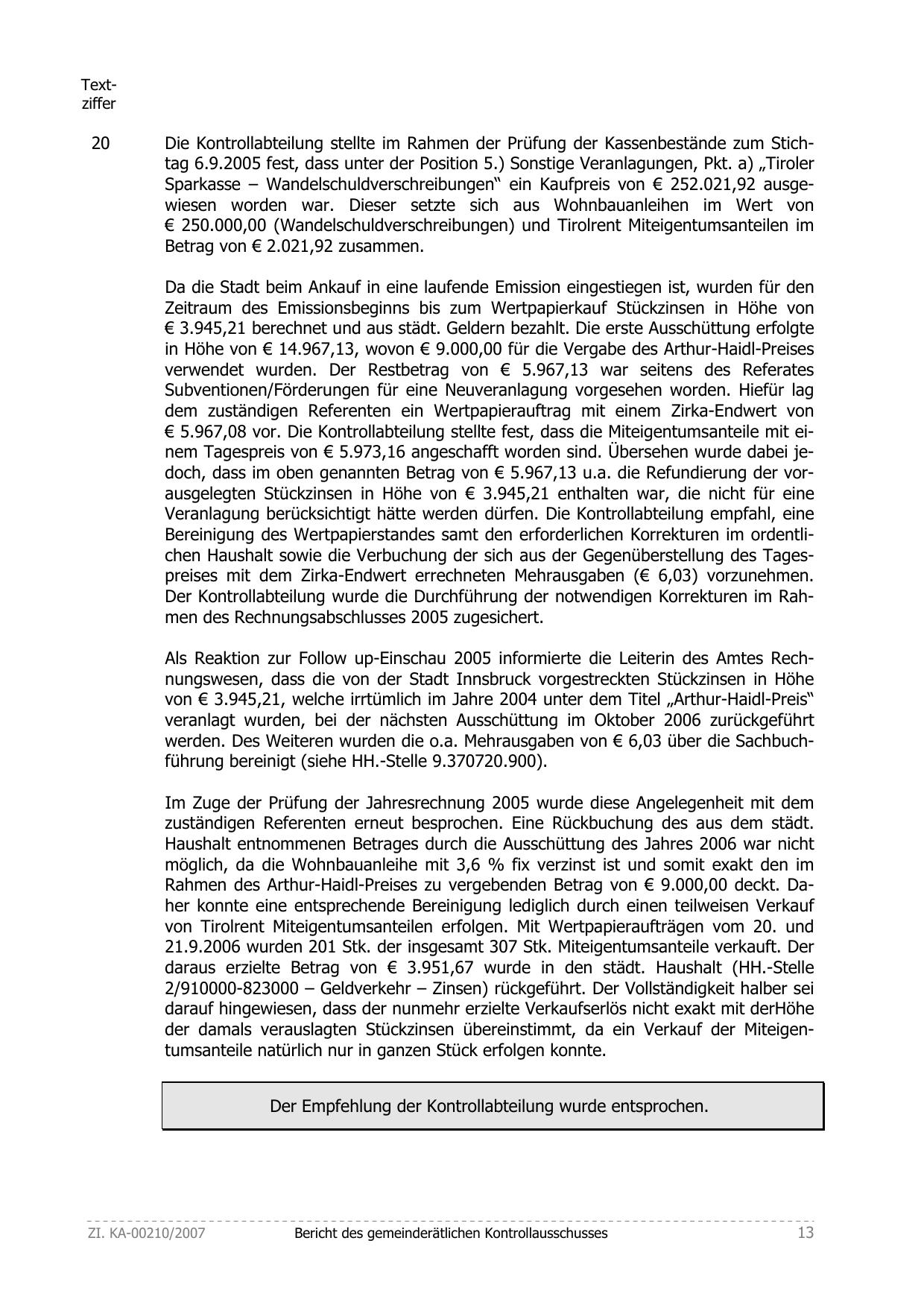 Bereinigung des Wertpapierstandes samt den erforderlichen Korrekturen im ordentlichen Haushalt sowie die Verbuchung der sich aus der Gegenüberstellung des Tagespreises mit dem Zirka-Endwert errechneten Mehrausgaben (€ 6,03) vorzunehmen.