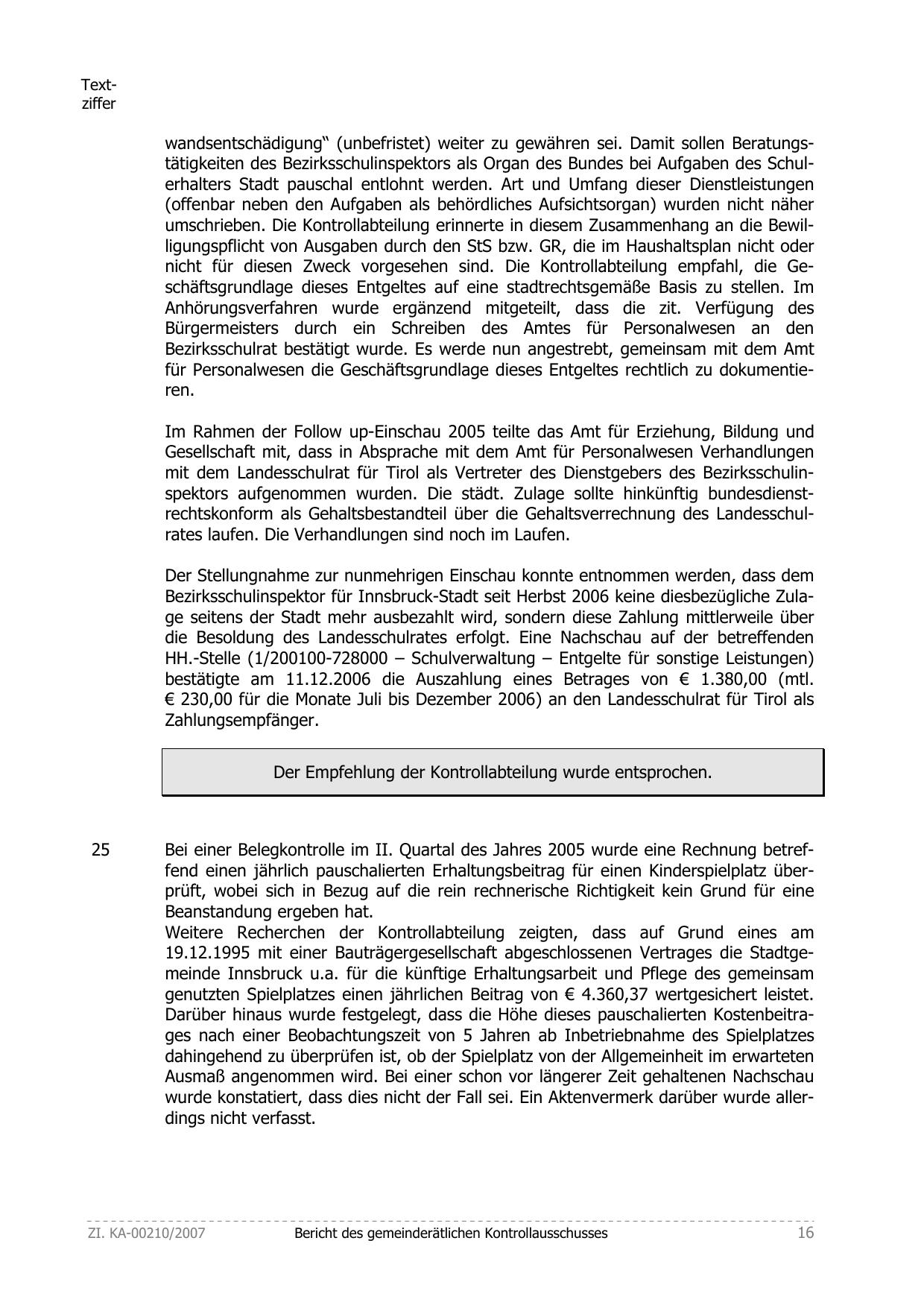 Bezirksschulinspektor für Innsbruck-Stadt seit Herbst 2006 keine diesbezügliche Zulage seitens der Stadt mehr ausbezahlt wird, sondern diese Zahlung mittlerweile über